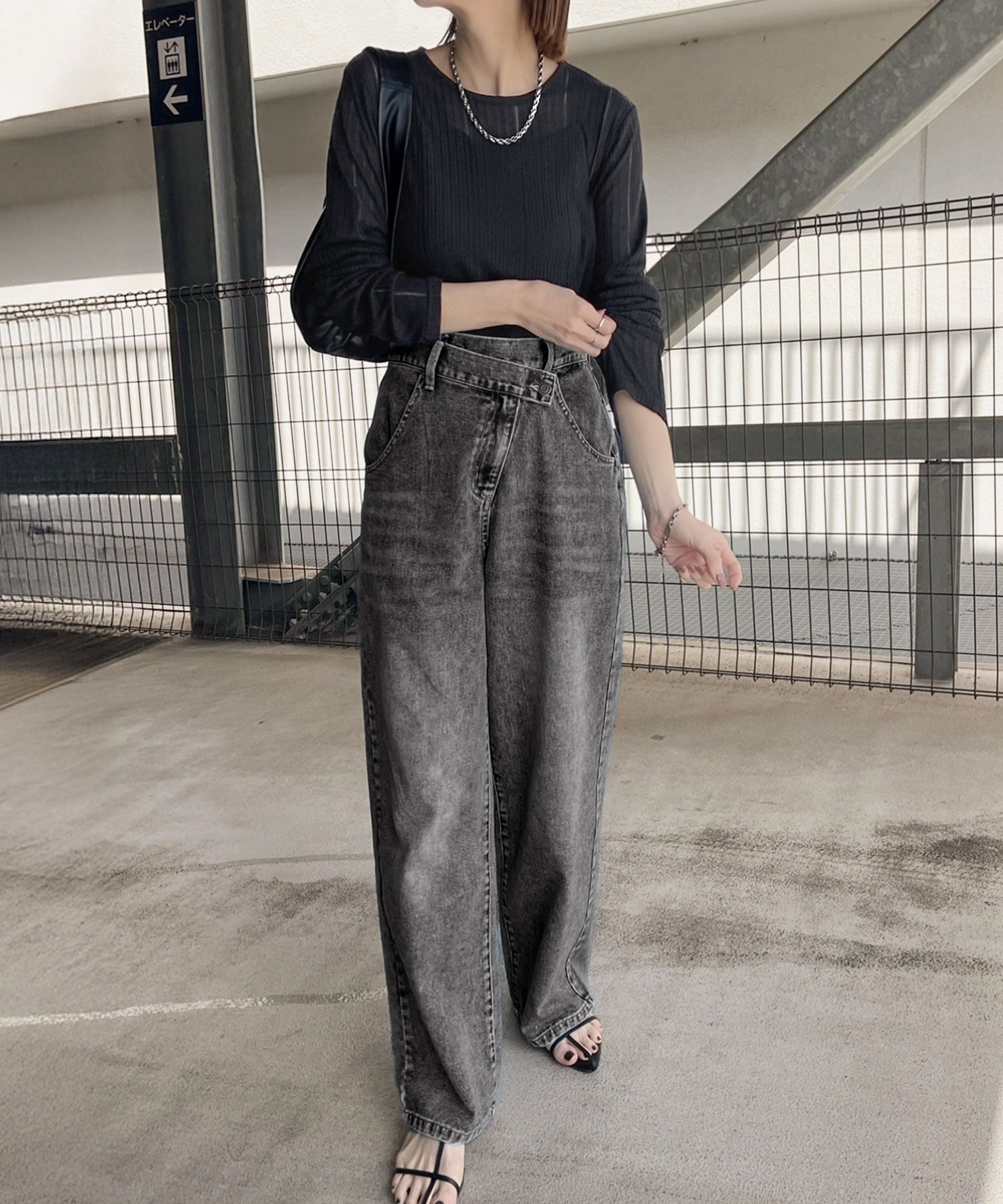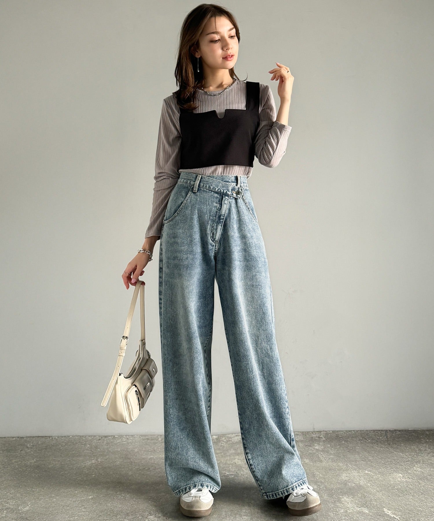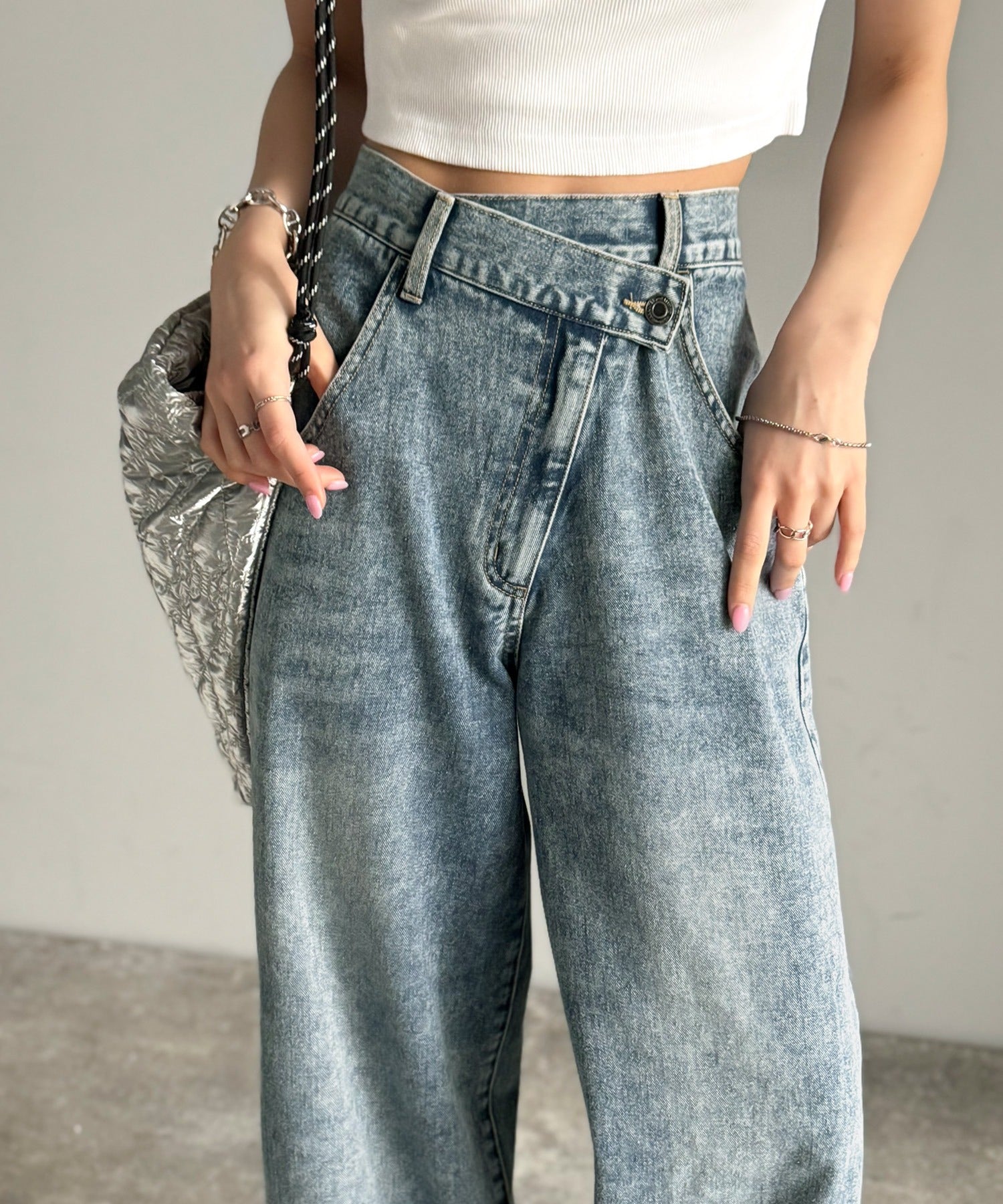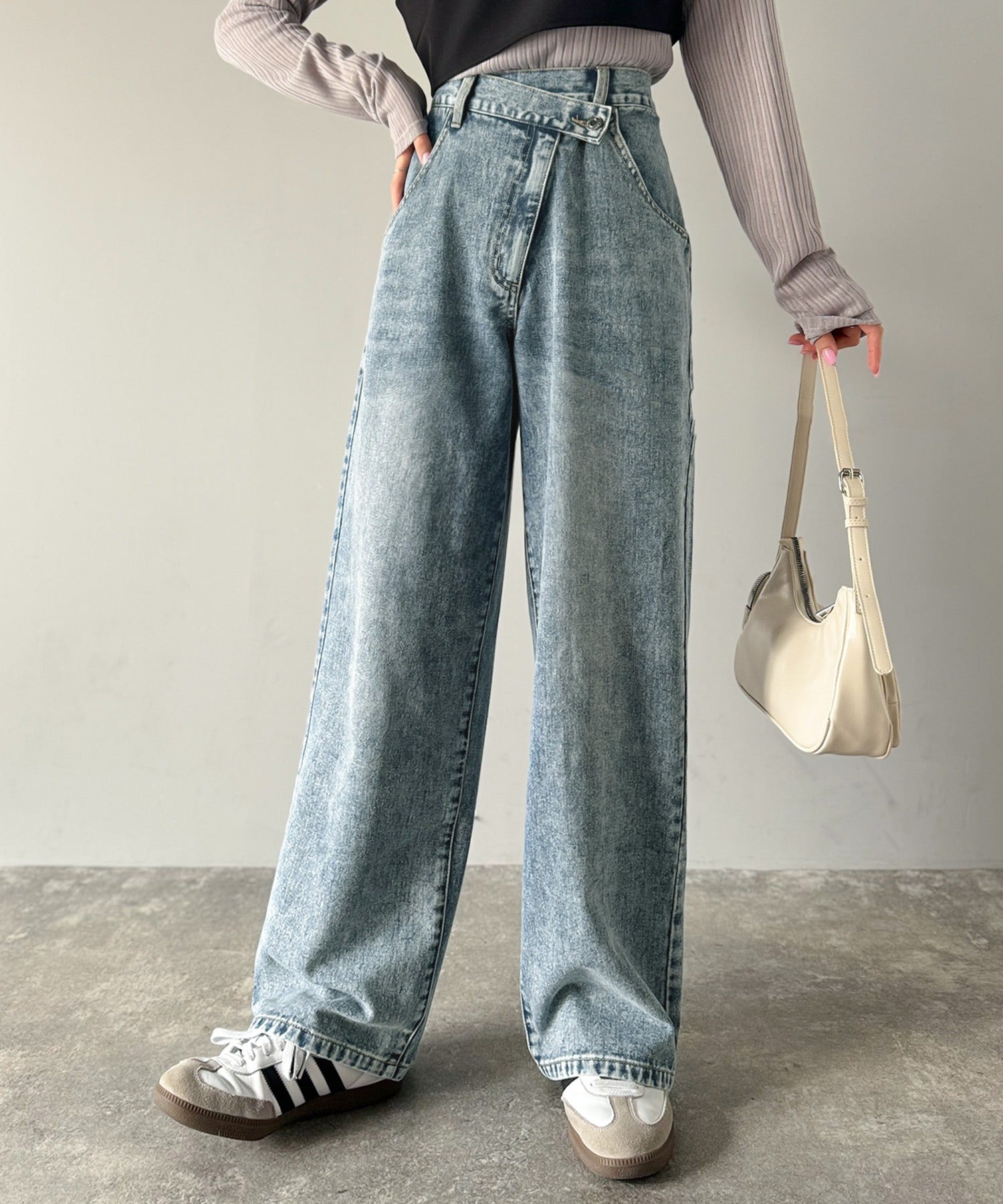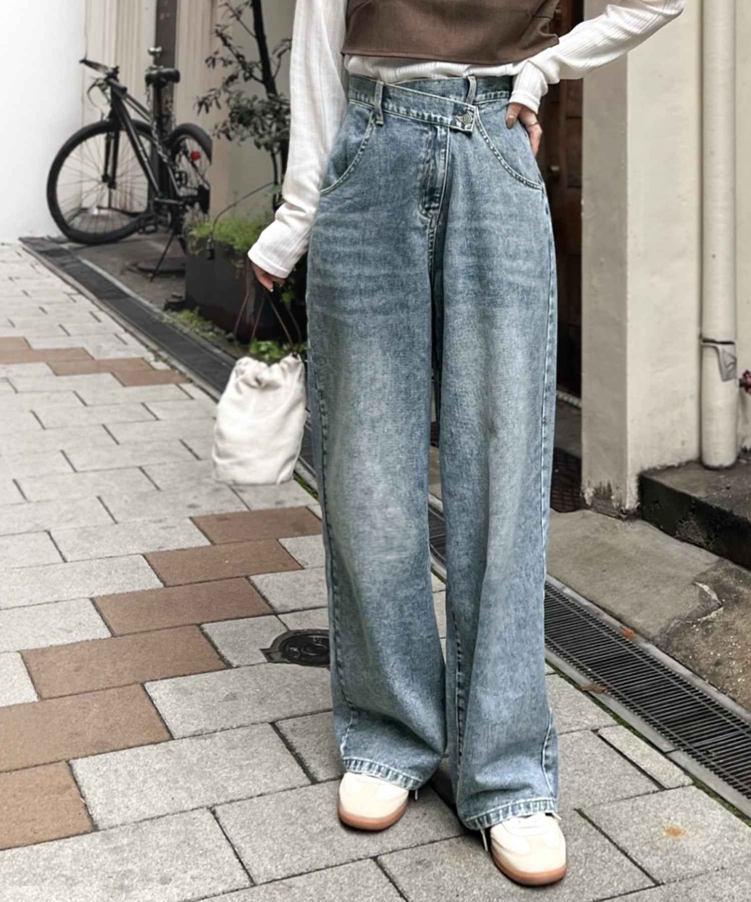 《sayo×クラシカルエルフコラボ》映えるウエストで、ちょい差しカジュアル!アシメウエストワイドデニム ce1015080