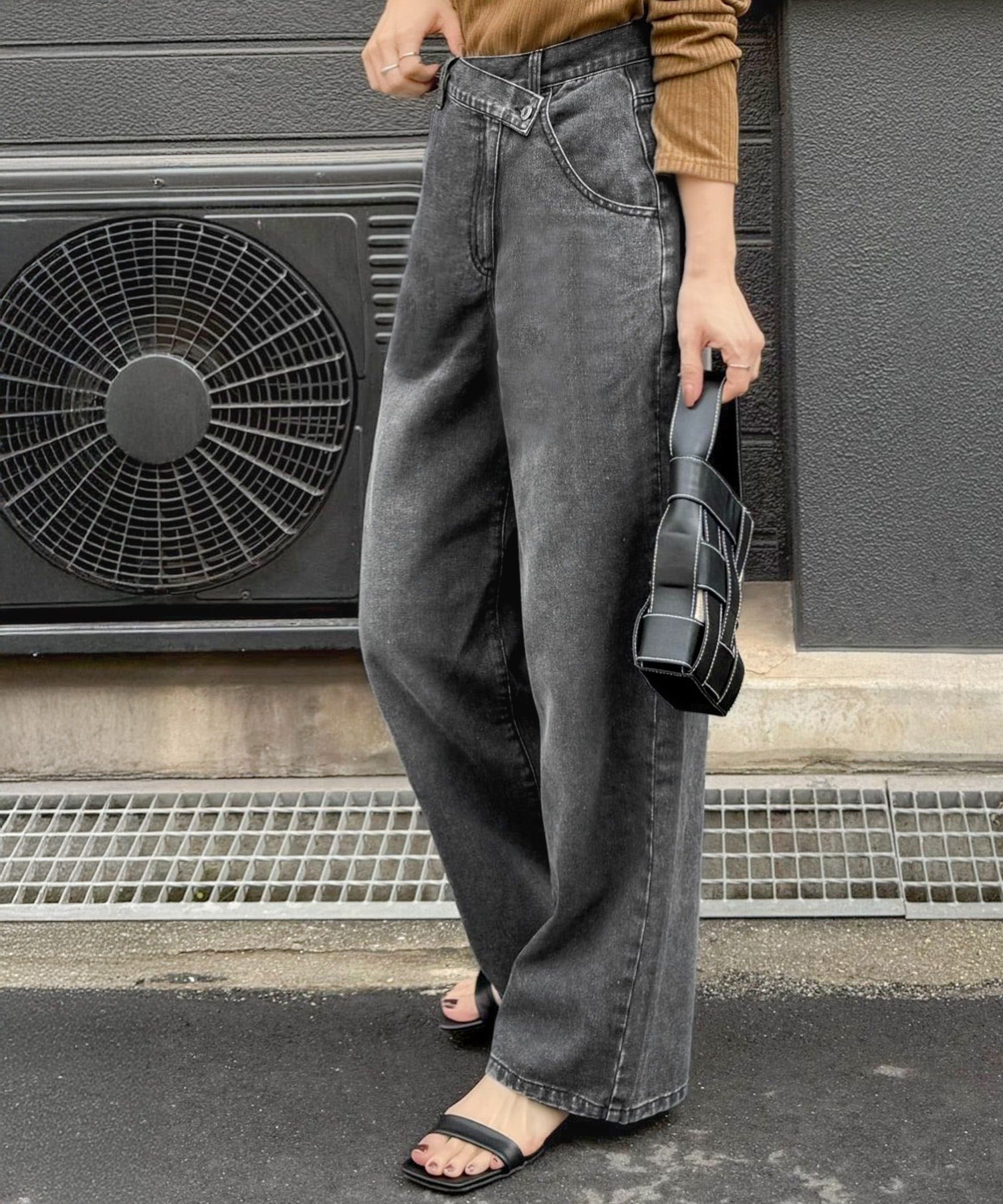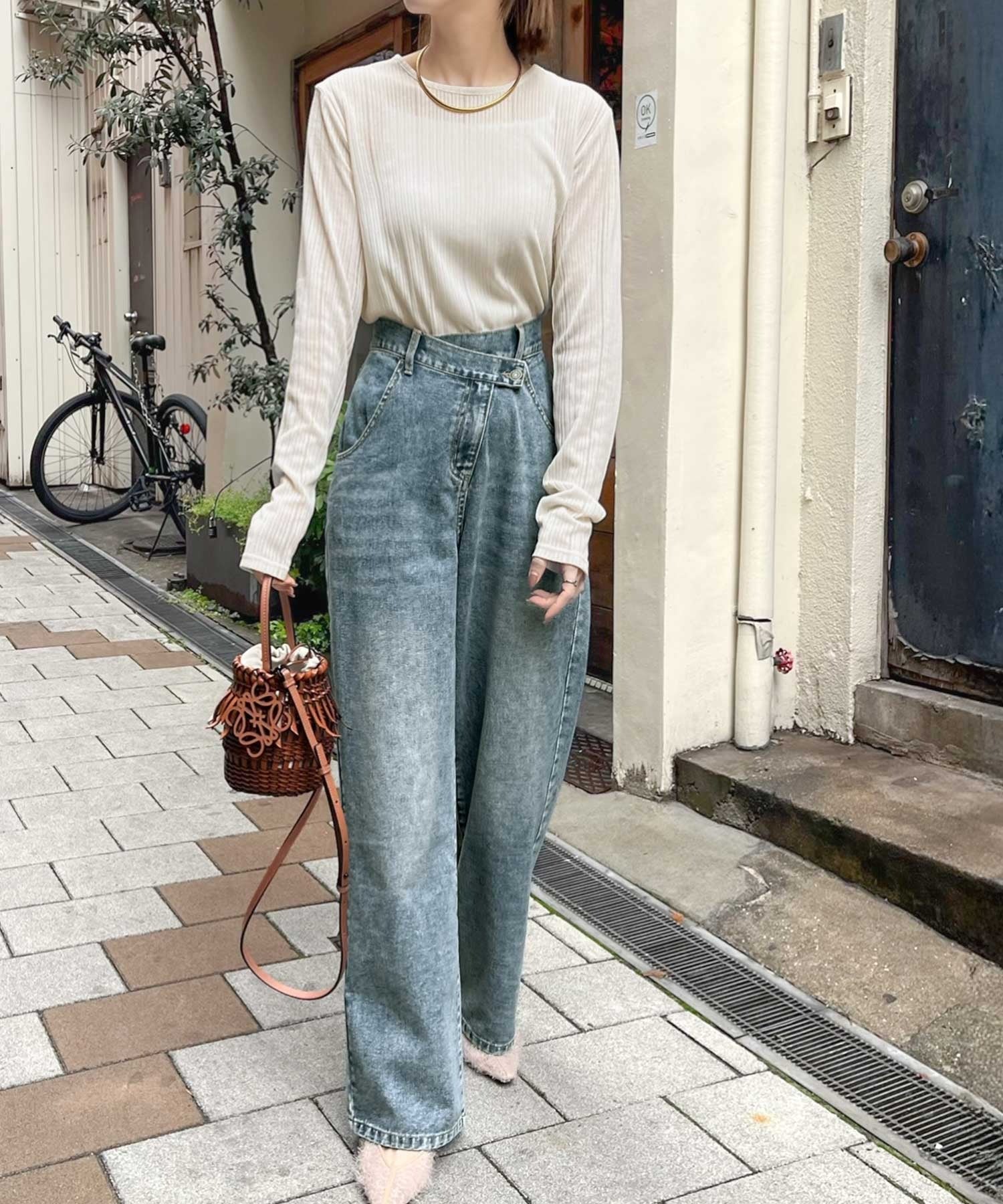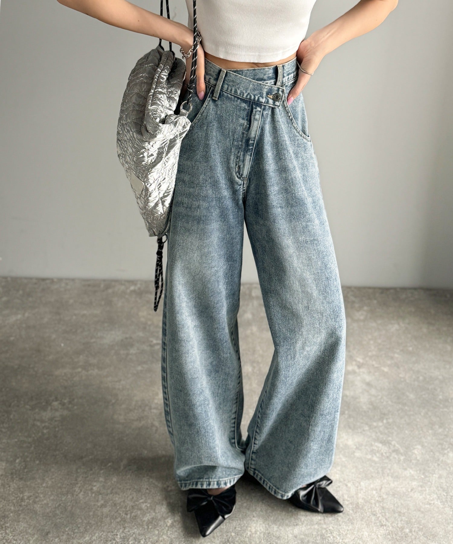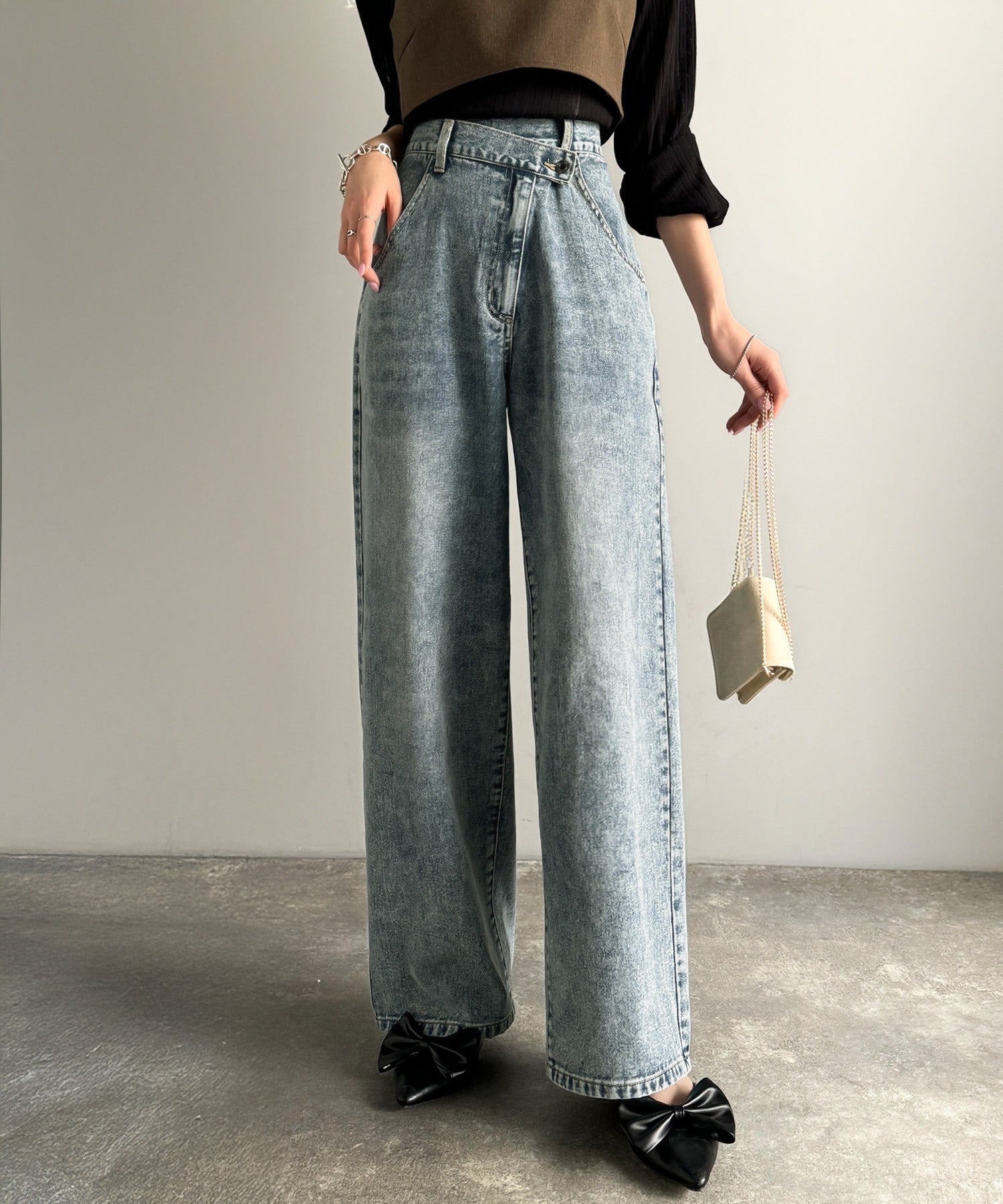 《sayo×クラシカルエルフコラボ》映えるウエストで、ちょい差しカジュアル!アシメウエストワイドデニム ce1015080