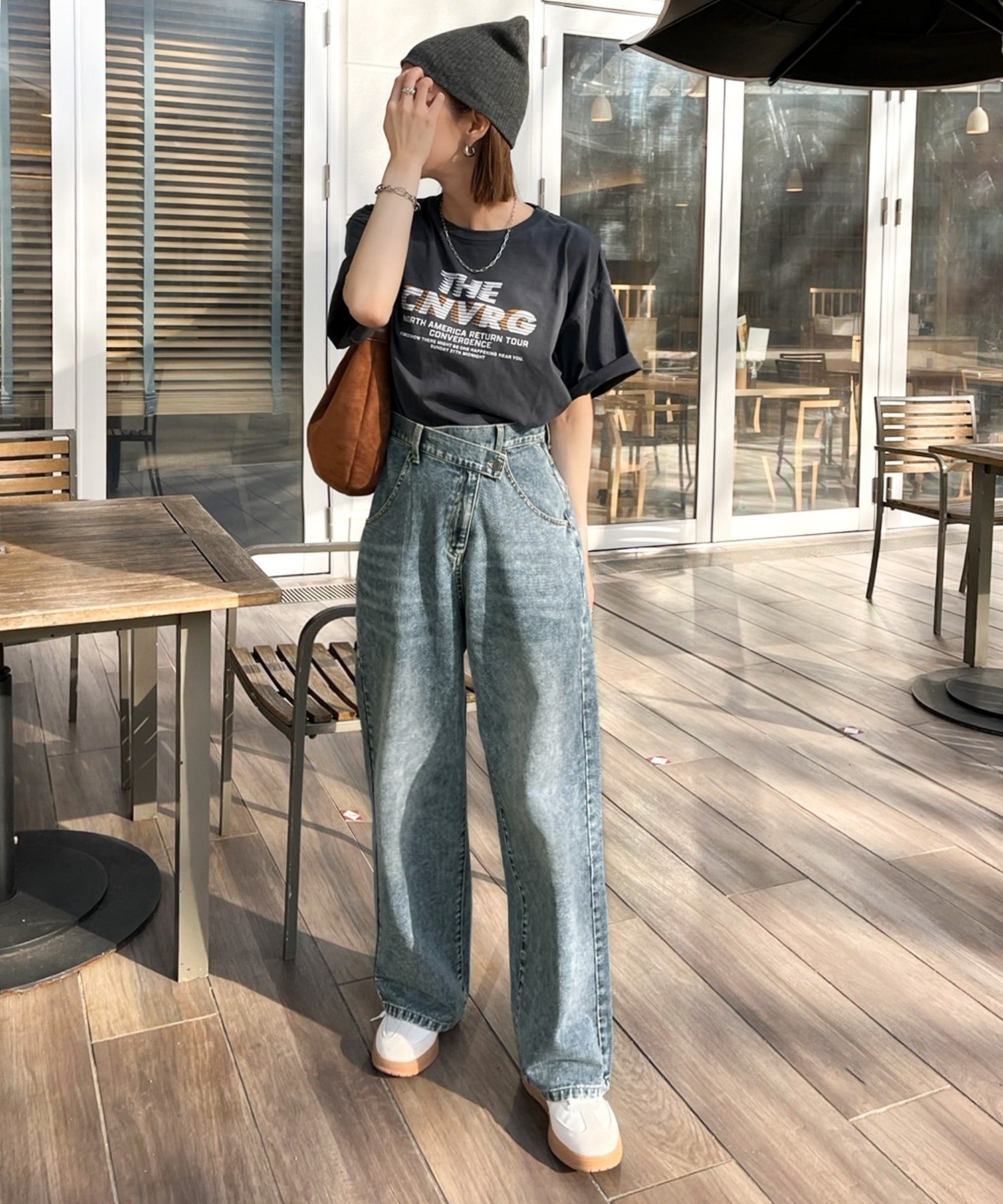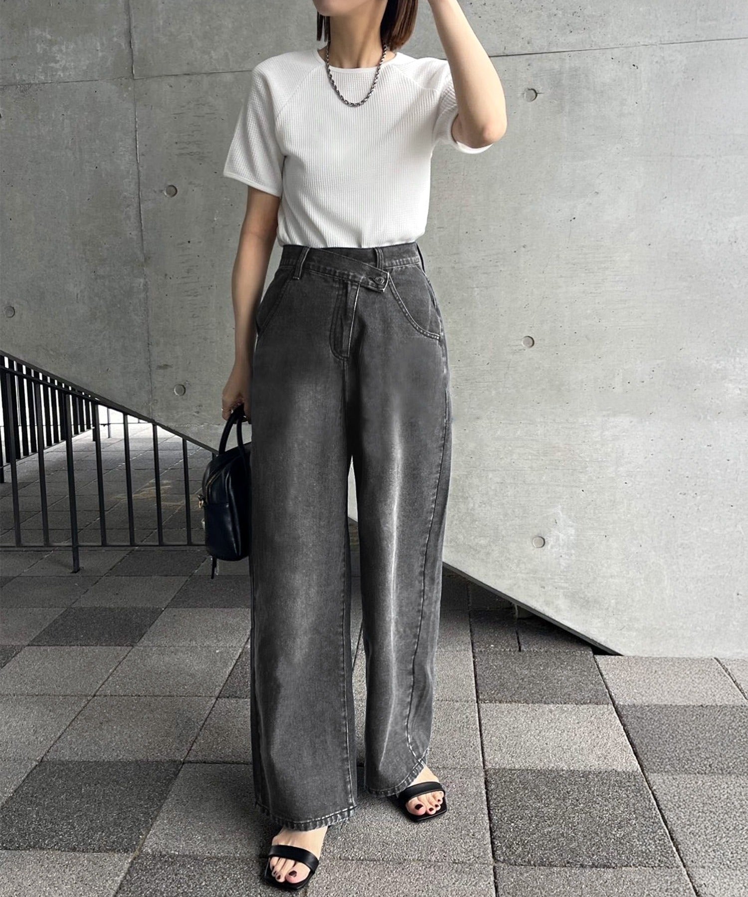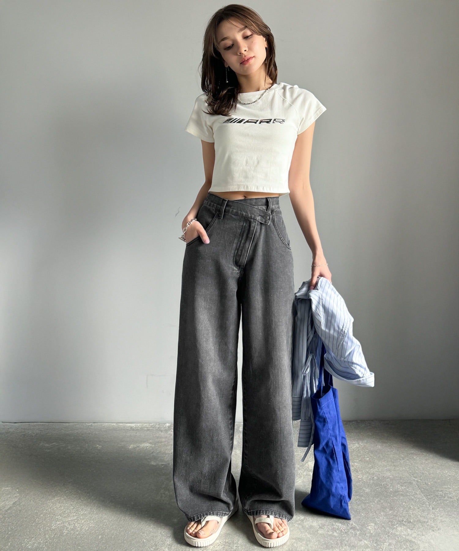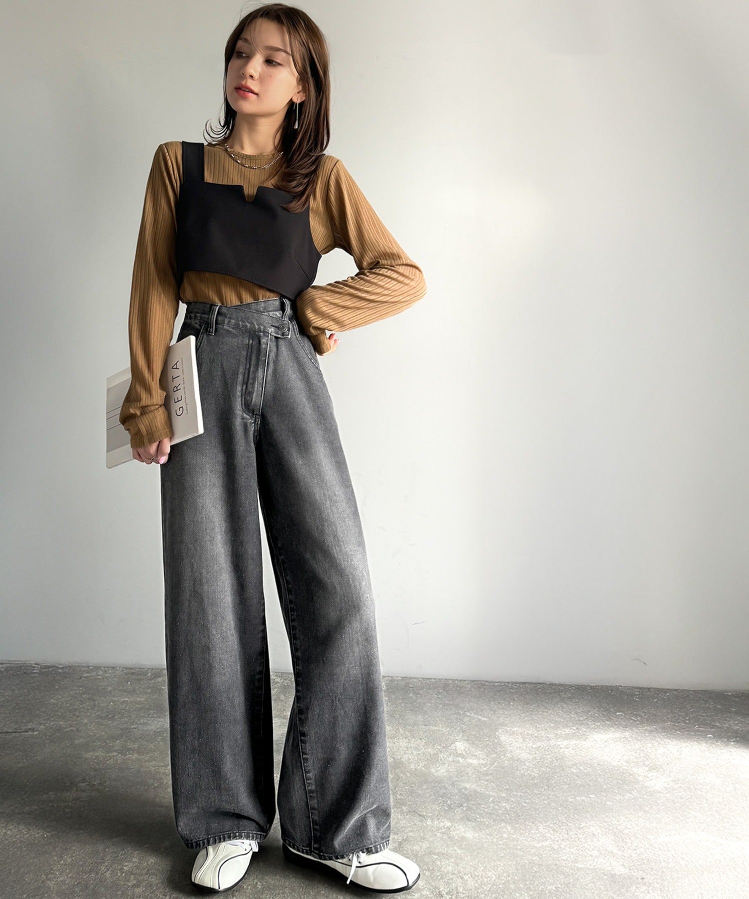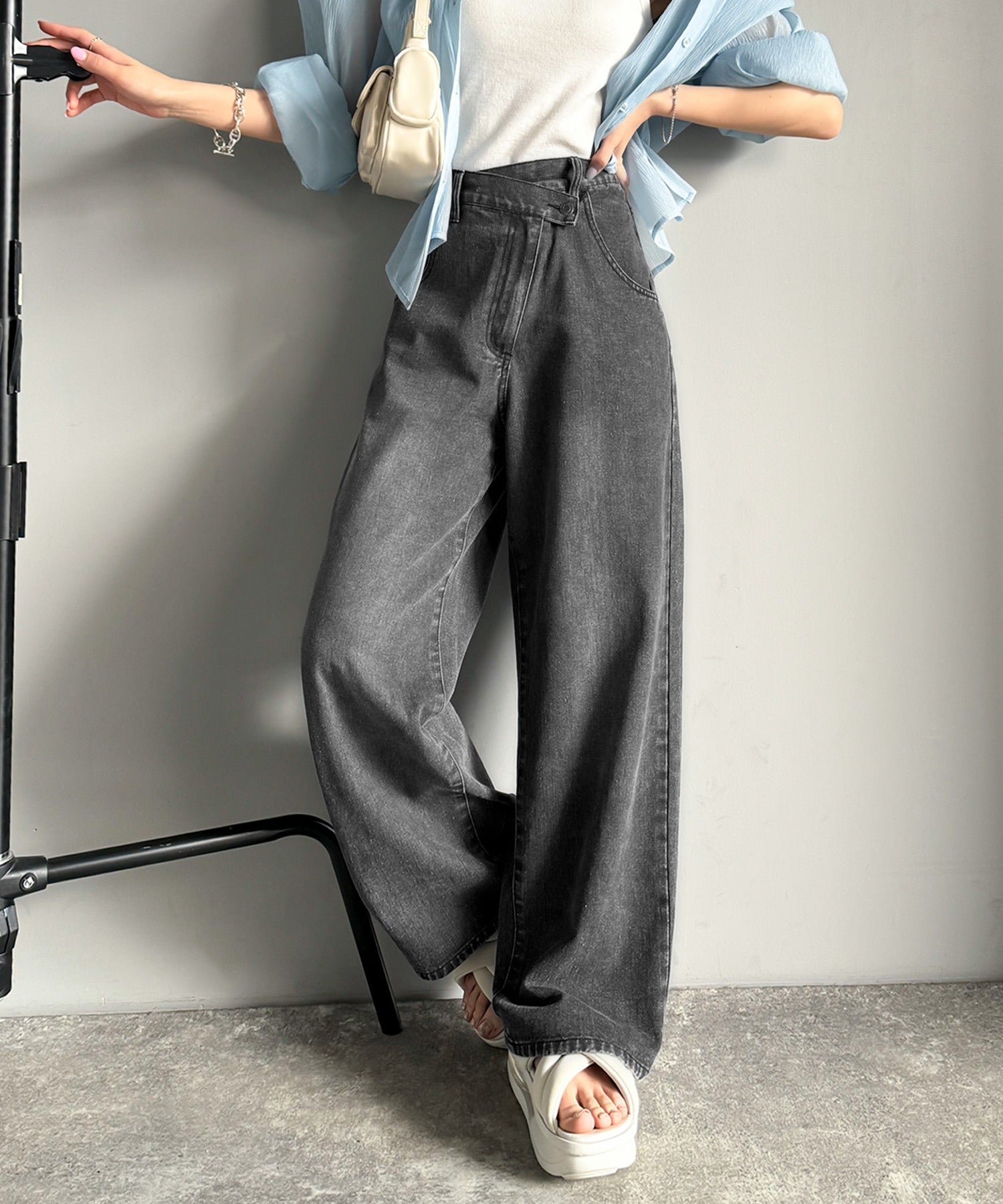 《sayo×クラシカルエルフコラボ》映えるウエストで、ちょい差しカジュアル!アシメウエストワイドデニム ce1015080