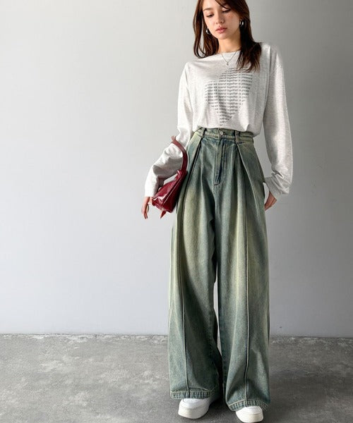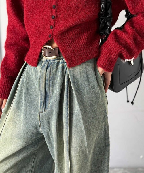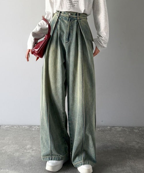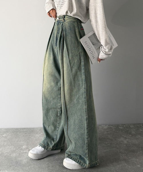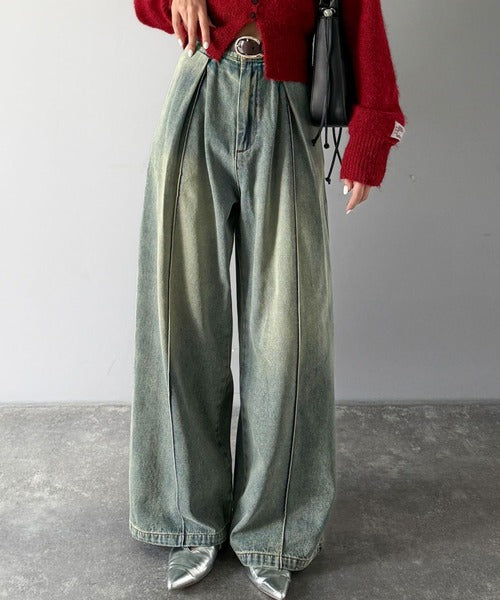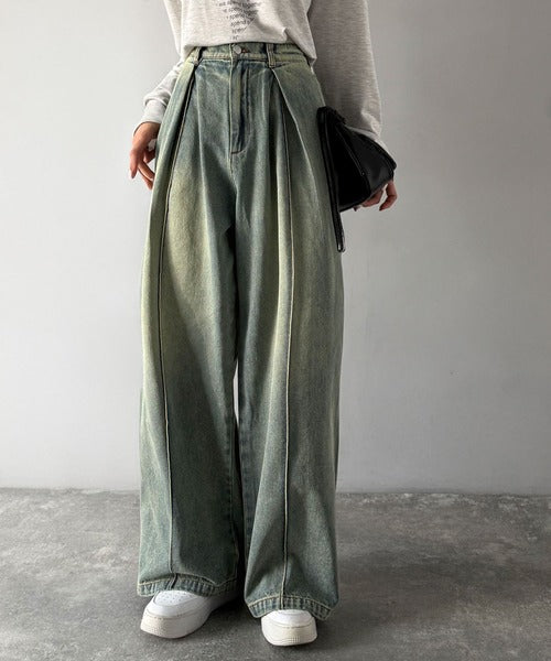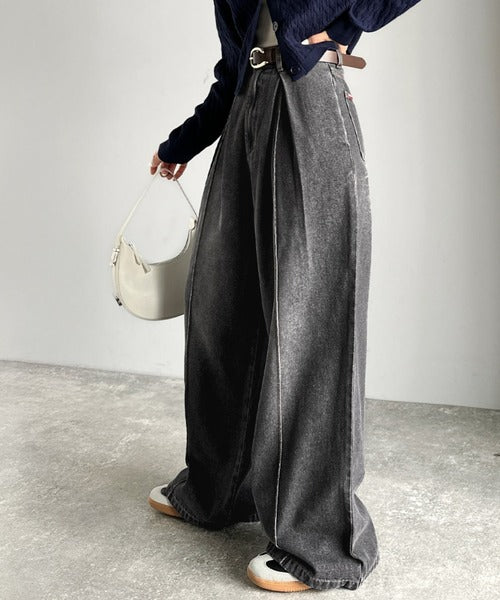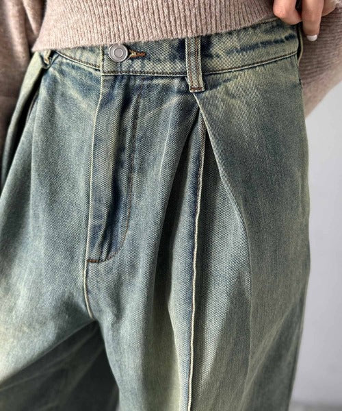 たっぷりとしたワイドシルエットが、独特な存在感を見せるダブルタックのデニムパンツ。