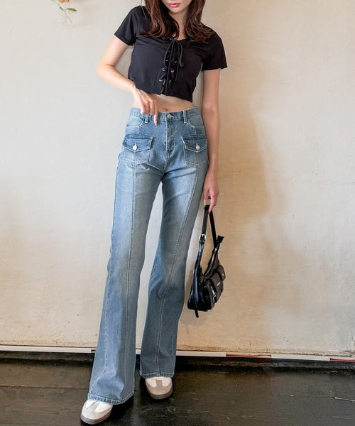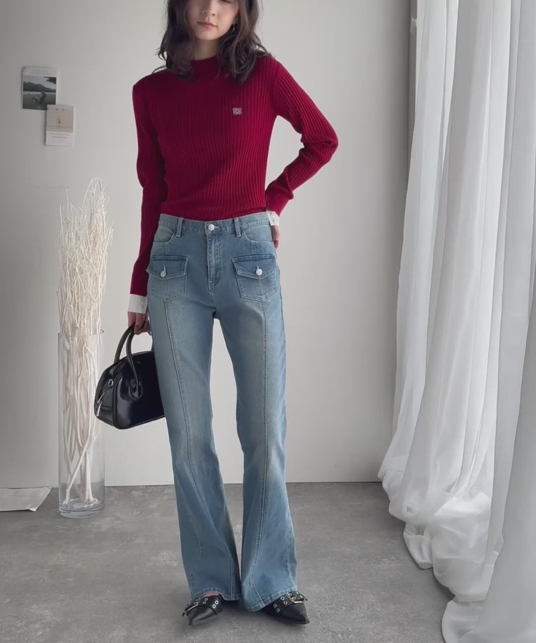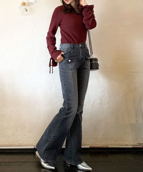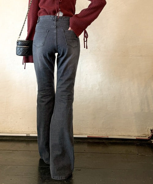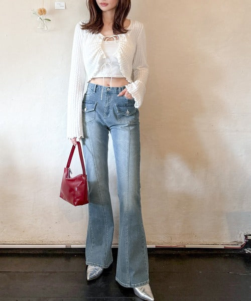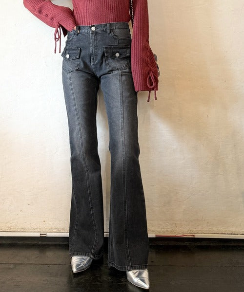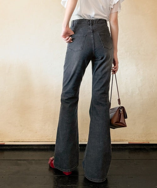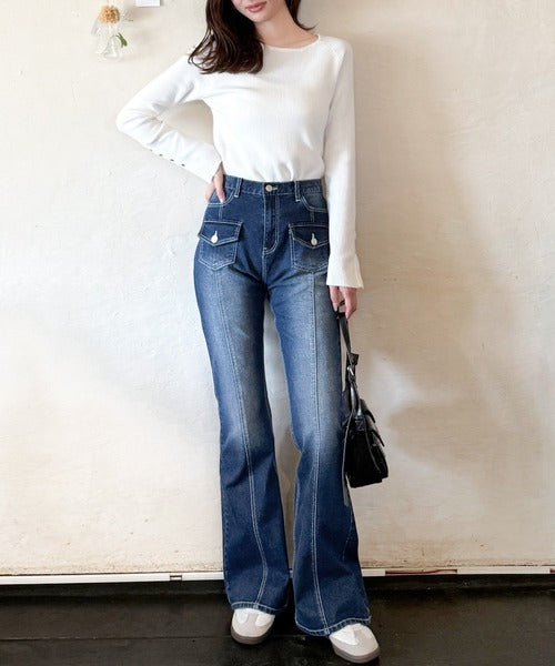 センターラインデザインのフレアデニムパンツはこのボトムスだけでアクセントになり、