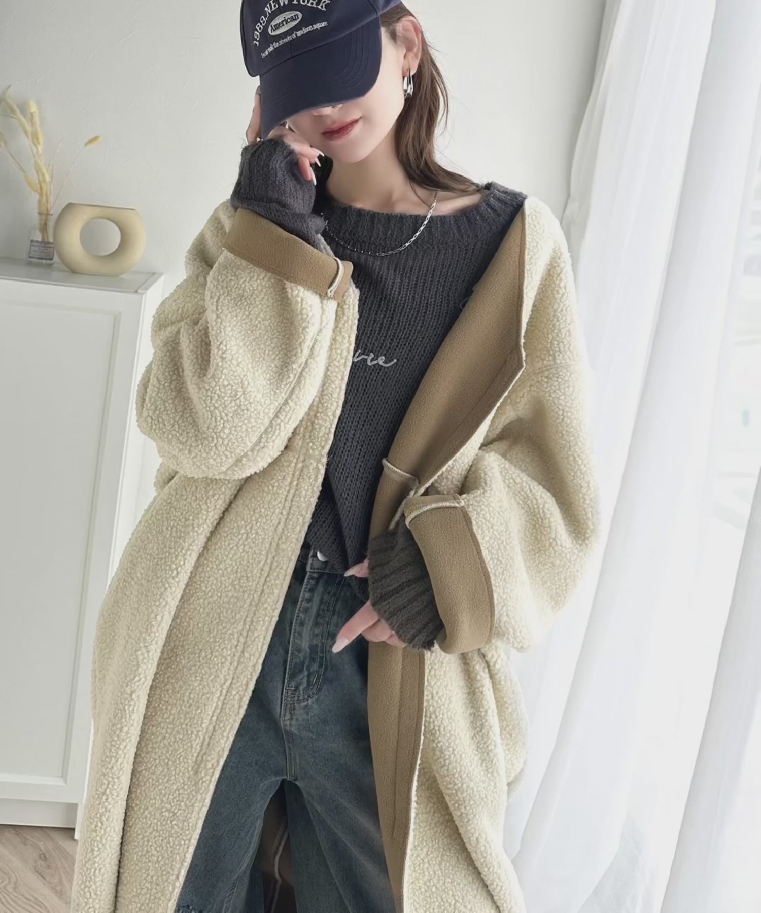 これ一枚で暖かい×大人の抜け感。表ボア×裏フリースダブルフェイス配色ノーカラーコート ce1260290