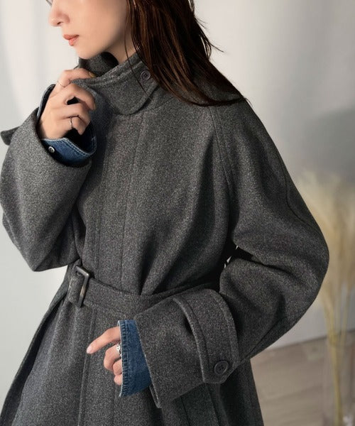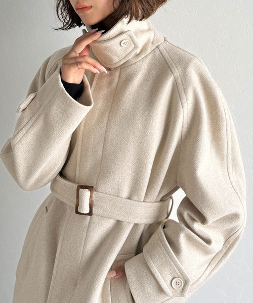 洗練された印象を与えるベルト付き比翼メルトンコート。
