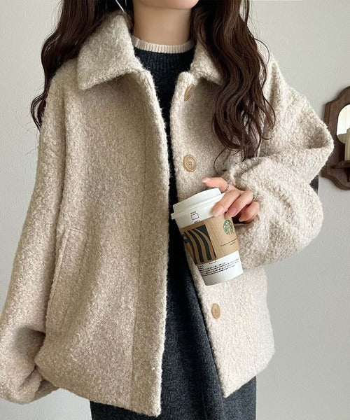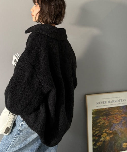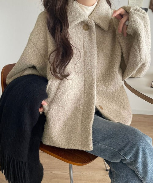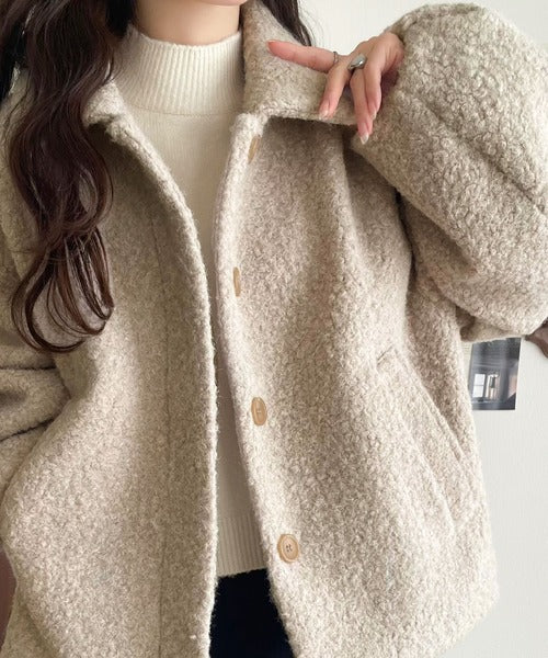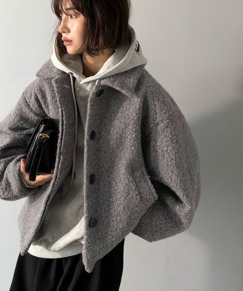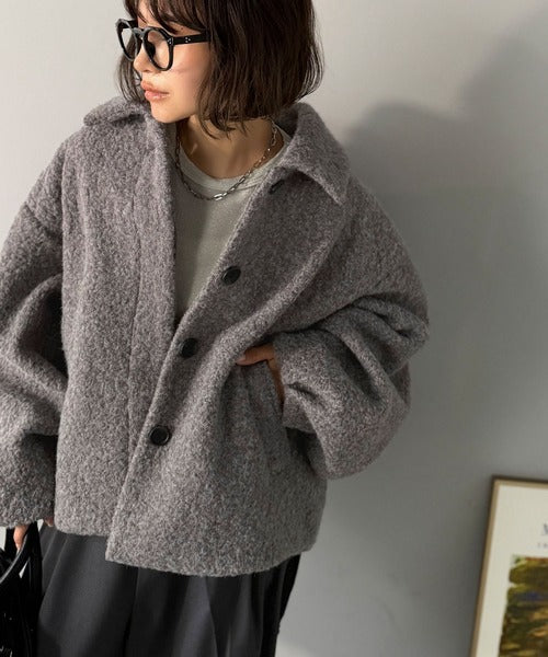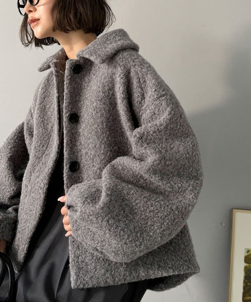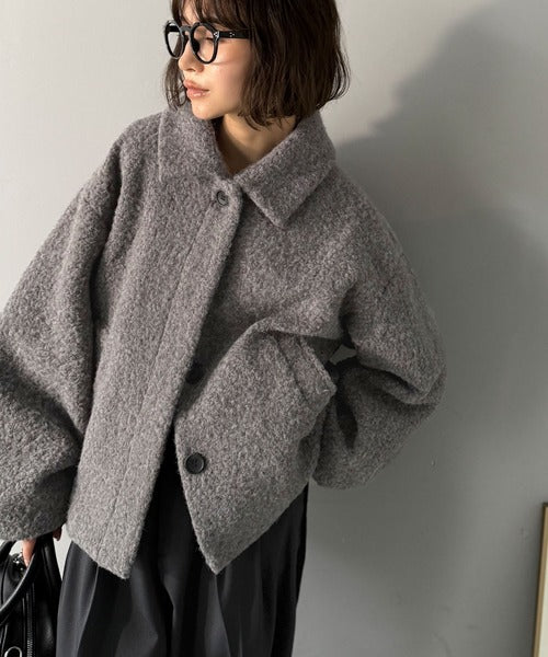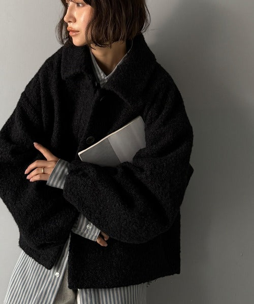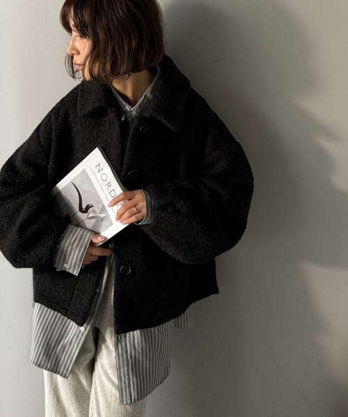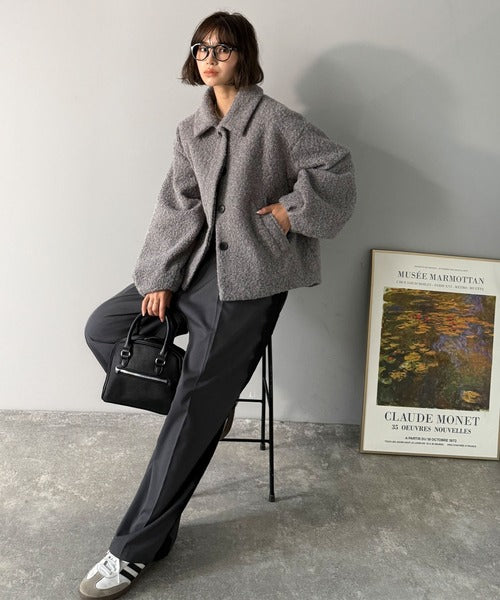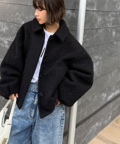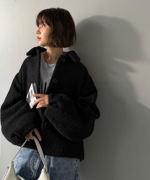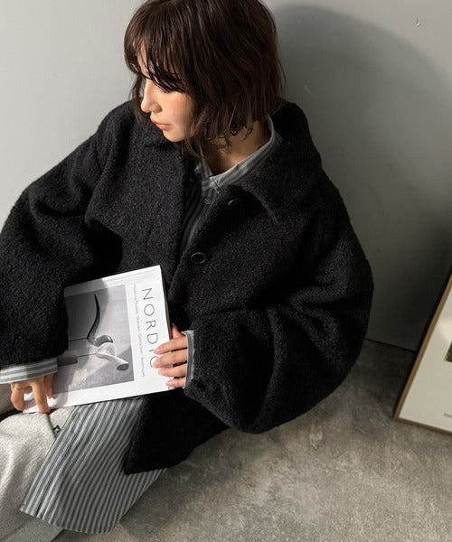 襟付きのボアジャケットは、ボリュームスリーブと丸みのあるコクーンシルエットが特徴。