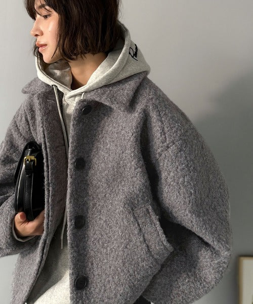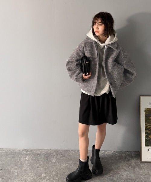 抜け感ときちんと感の絶妙バランスを実現したコクーン襟付きボアジャケット。