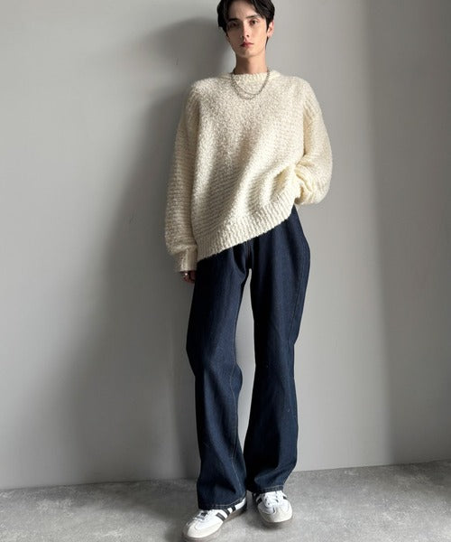 /Boucle yarn crew neck knit top」