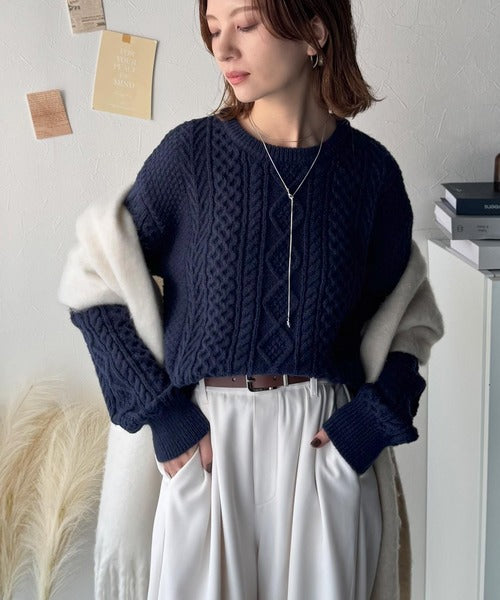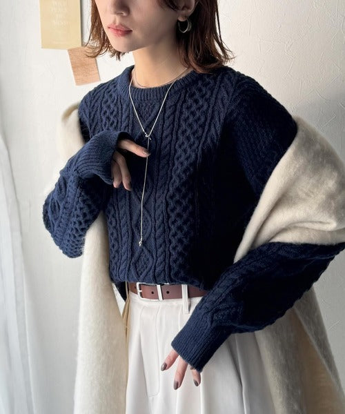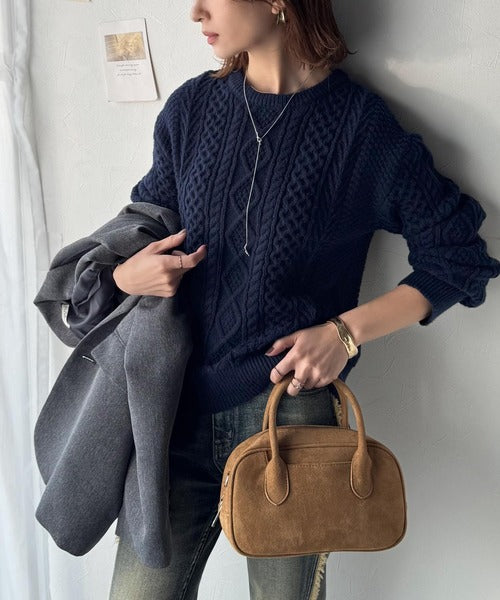 クラシックな美しいアラン柄を組み合わせた編地が特徴のケーブルニット。