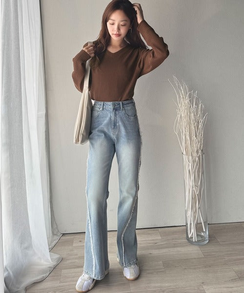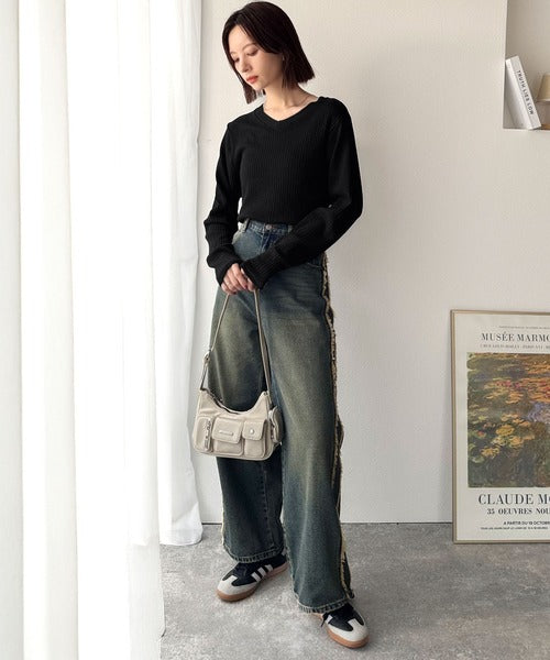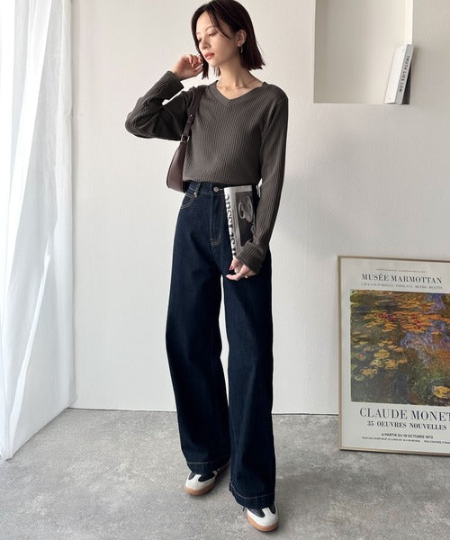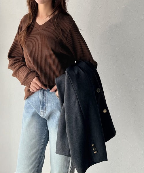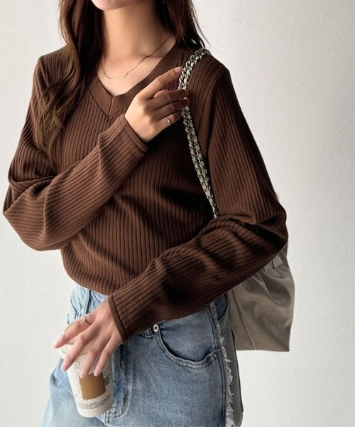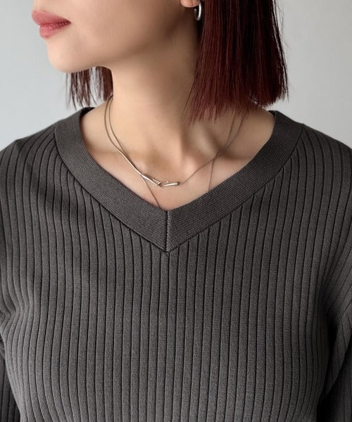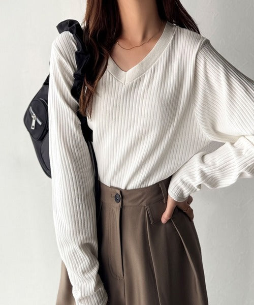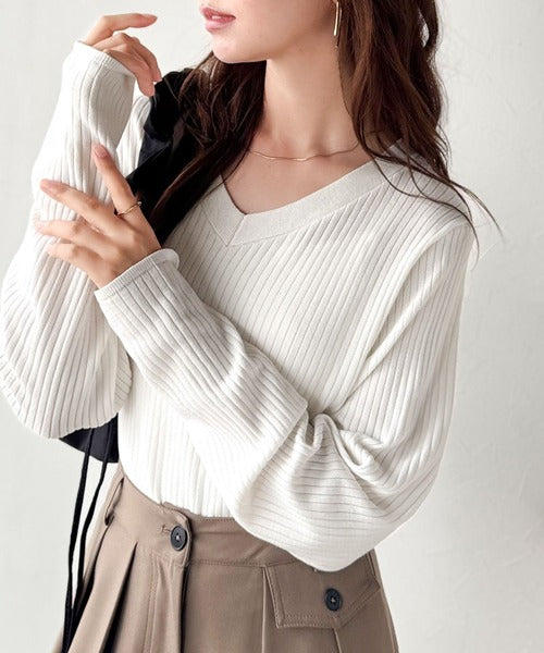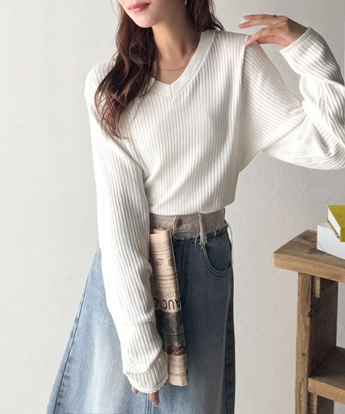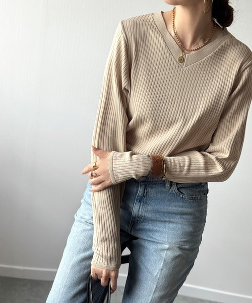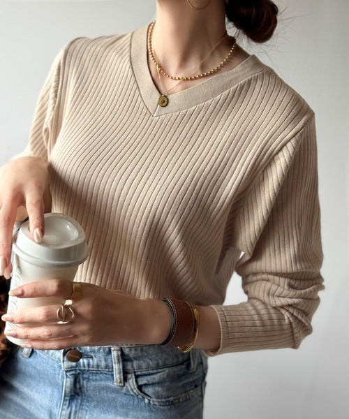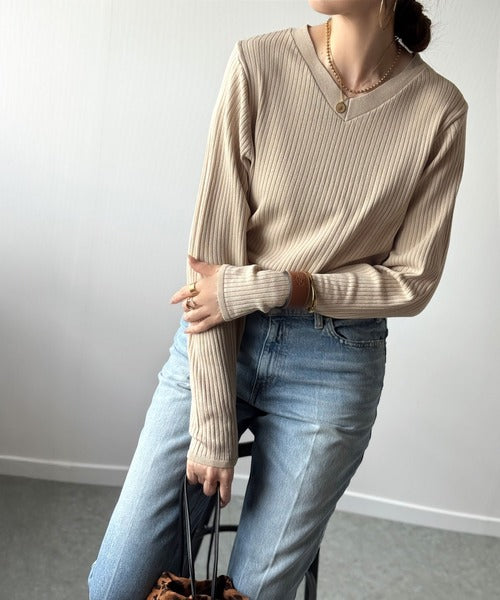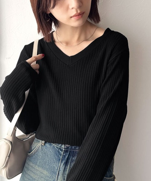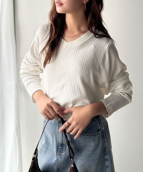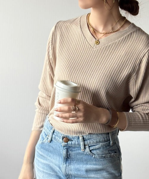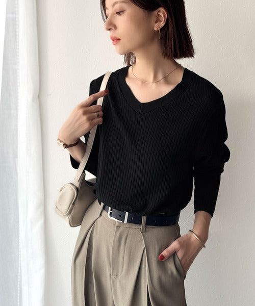 針抜きリブを使用したニット素材で、軽やかに着こなせるVネックトップス。