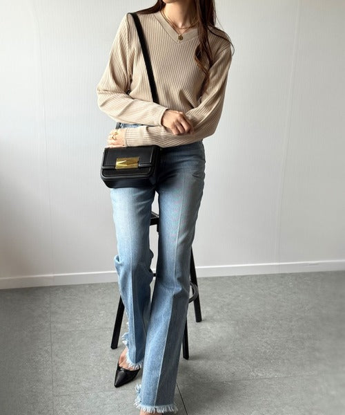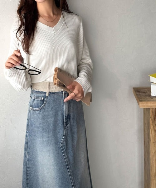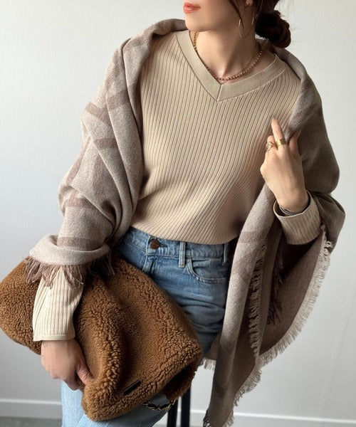 Vネックがデコルテをきれいに見せて、カジュアルにもきれいめにもマッチ。