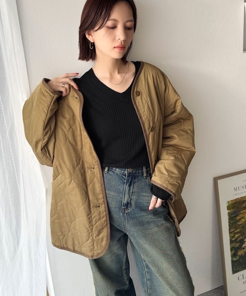 ゆとりのある袖まわりと、すっきりとしたVネックが大人っぽい抜け感を演出。