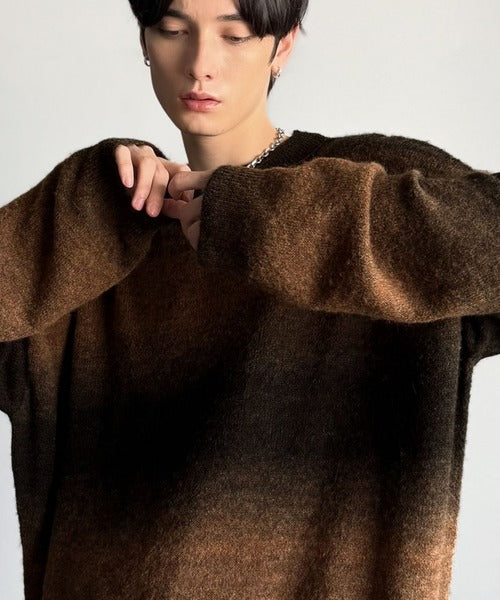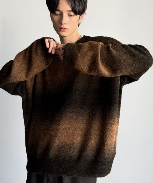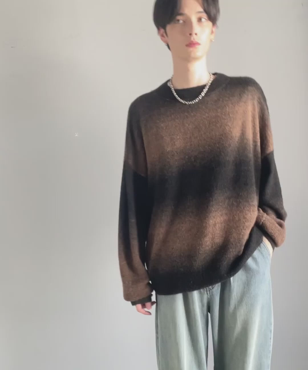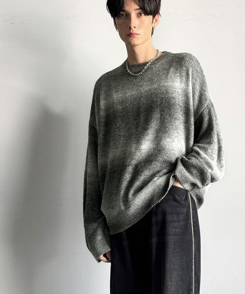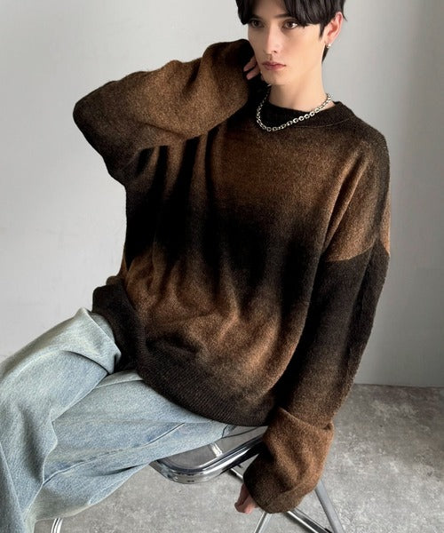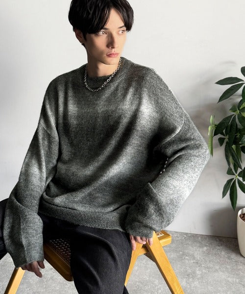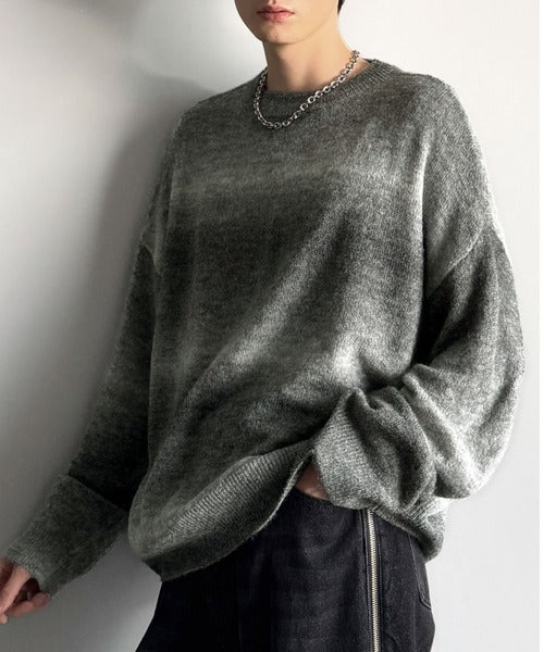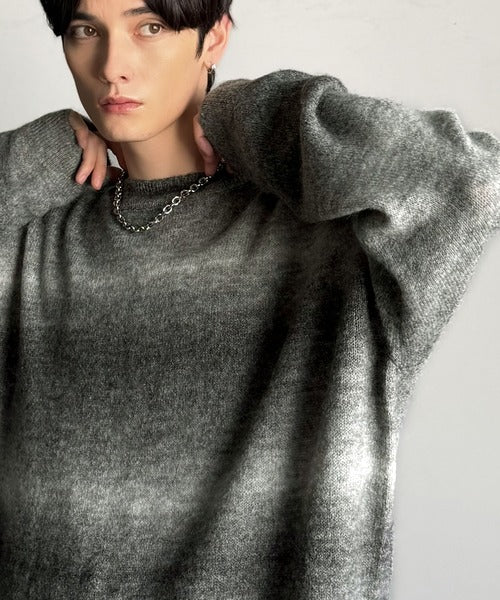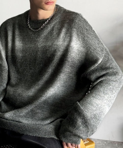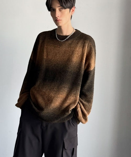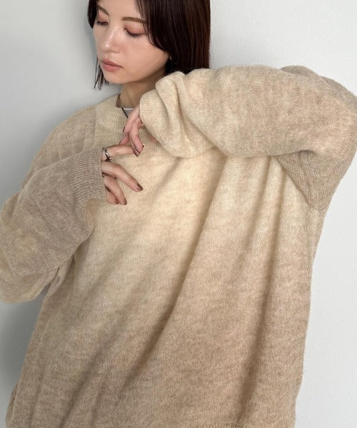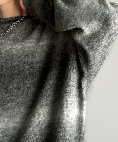 シンプルながらも、繊細な透かし編みとグラデーションカラーが目を引くデザインニット。