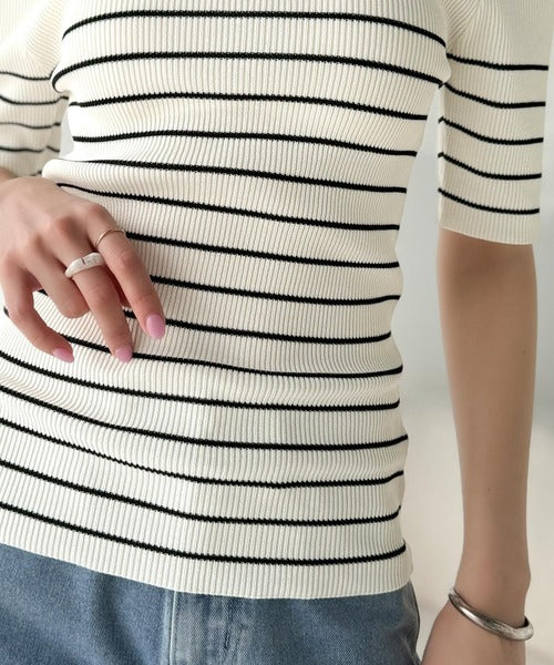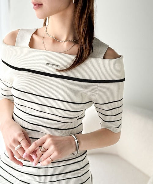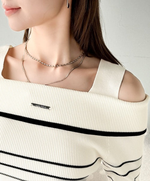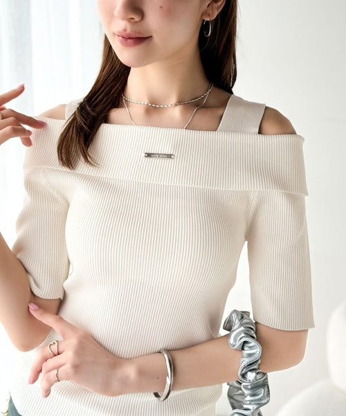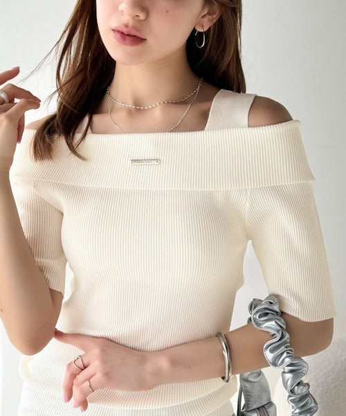 上質なリブ素材を採用し、肌に心地よくフィットする快適な着心地を追求したプレート使いオフショルニット。