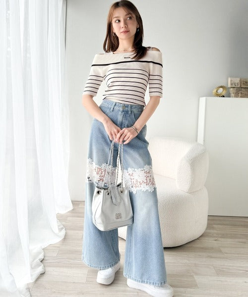 このプレート使いオフショルニットは、デニムとの相性も抜群!