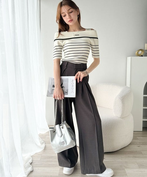 トレンド感溢れるオフショルデザインが、デコルテラインを美しく見せるだけでなく、気温の上がる春夏シーズンに涼しげな印象をプラス!