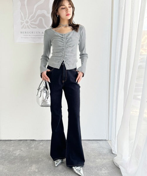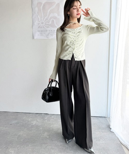 胸元のシャーリングで胸元キレイ見せ効果の洗練ニット。