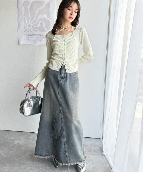 デコルテを美しく見せる胸シャーリングデザインのニットトップス。
