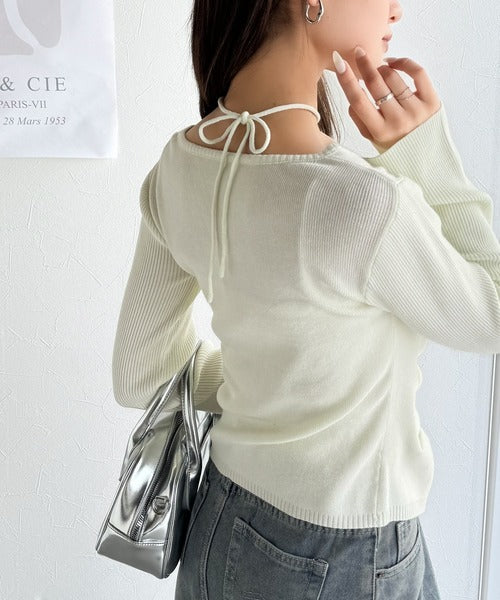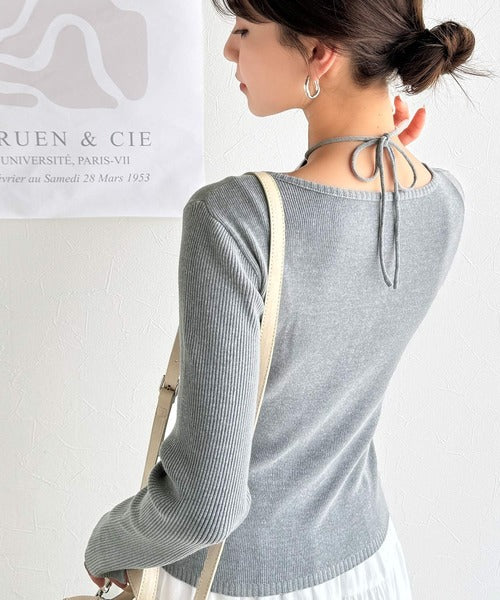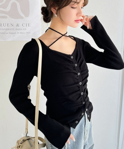 【mily bilet】デコルテ華奢魅せ。チョーカー紐&ブローチ付き胸シャーリングニットプルオーバー(長袖) mi1259011