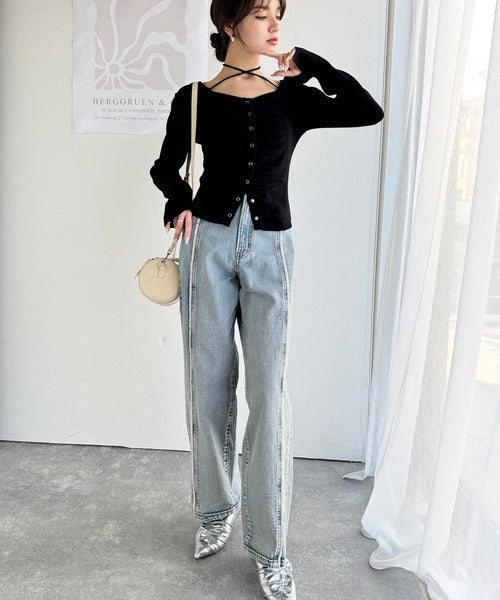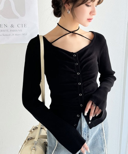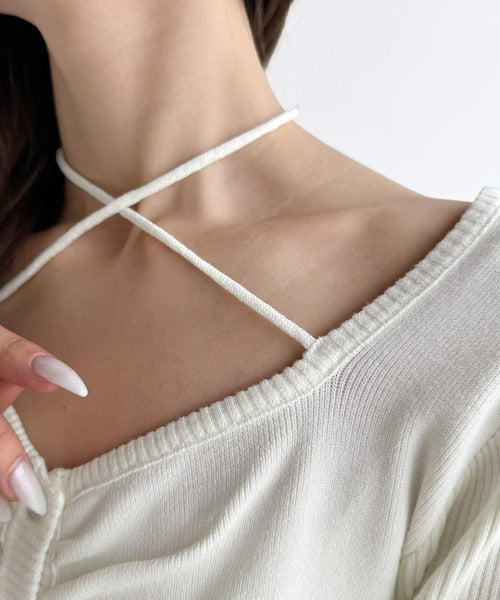 チョーカー紐がアクセントになり、シンプルながらも存在感のあるスタイルに◎
