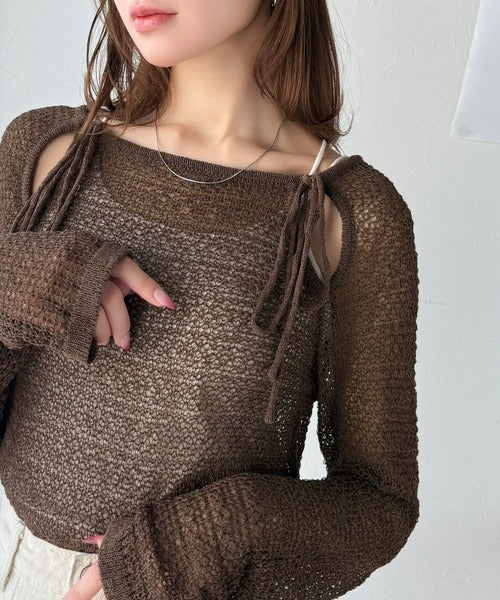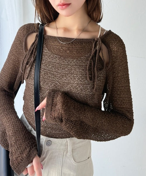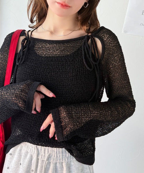 ちらりと見える肩の肌見せと、ほどよい透け感のメッシュ編みで