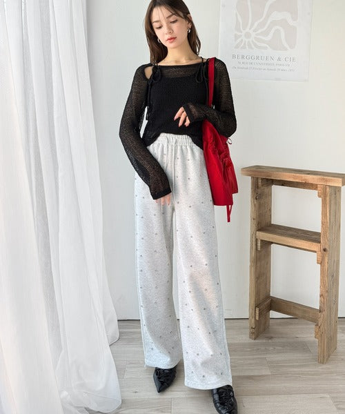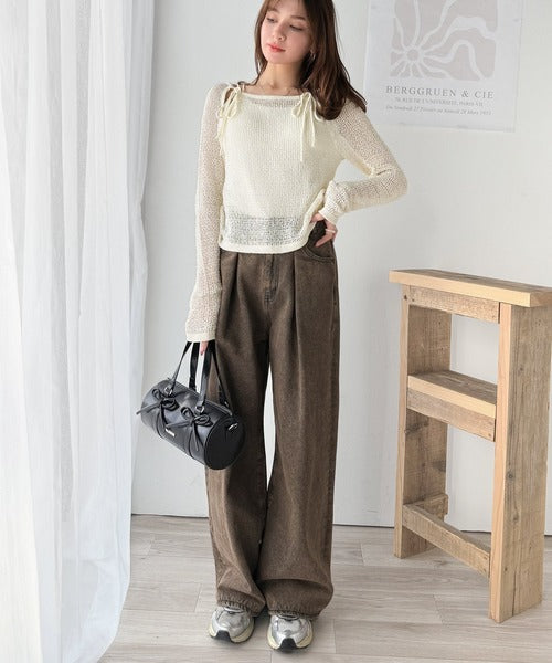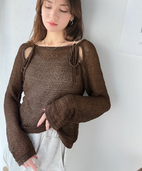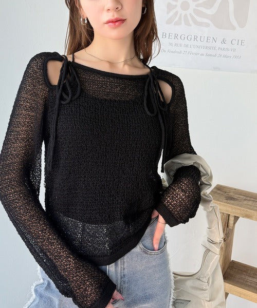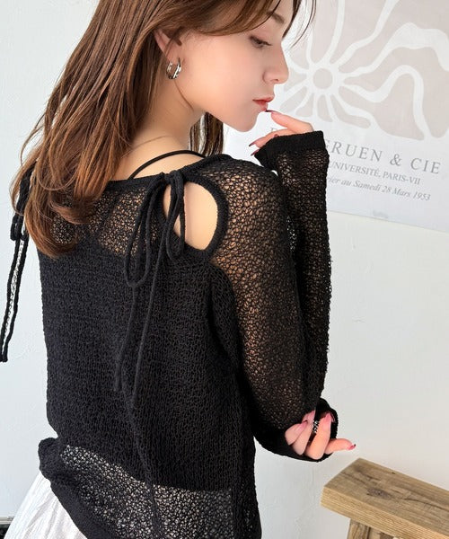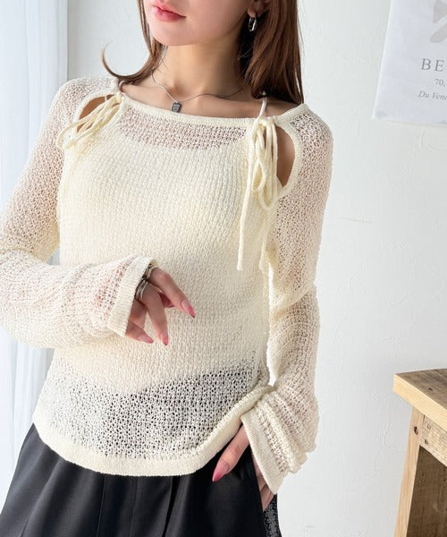 【mily bilet】大人かわいい肌見せを叶える。プレートデザイン前後2WAYメッシュ編み肩リボンニットプルオーバー(長袖) mi1259014