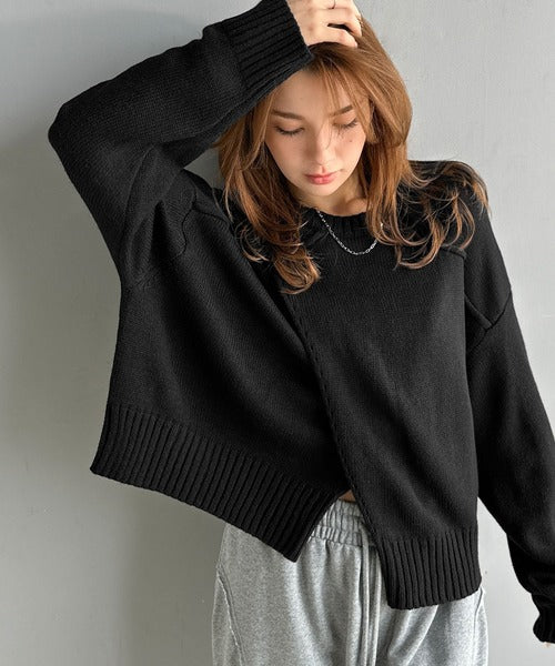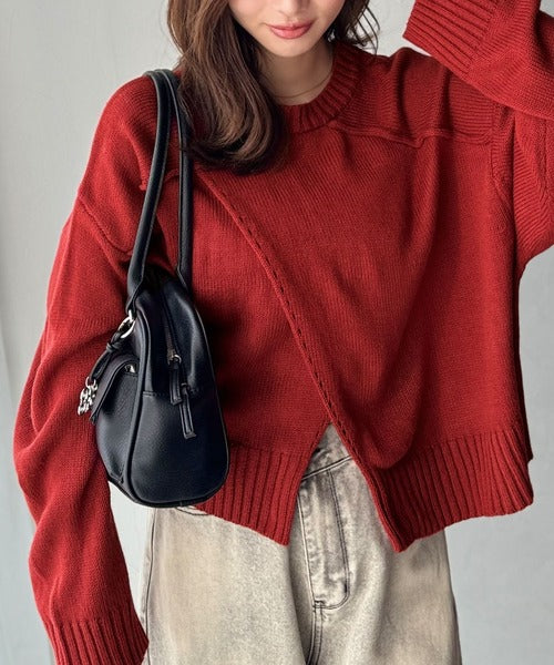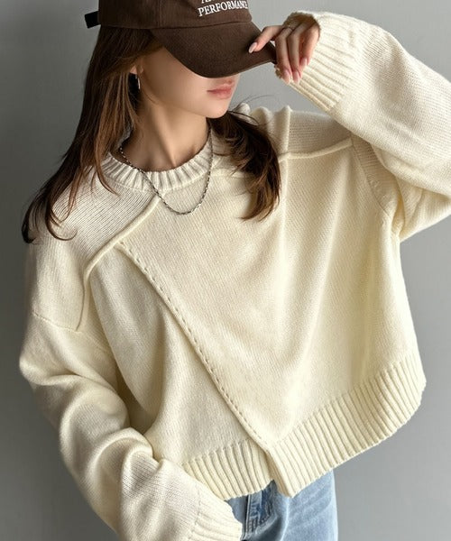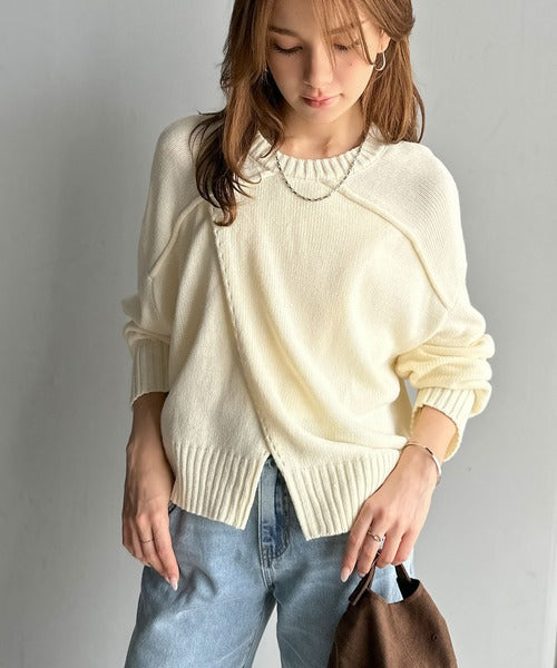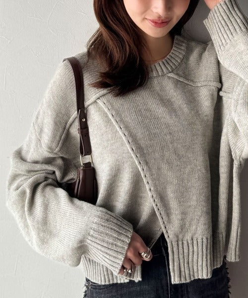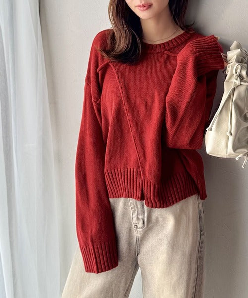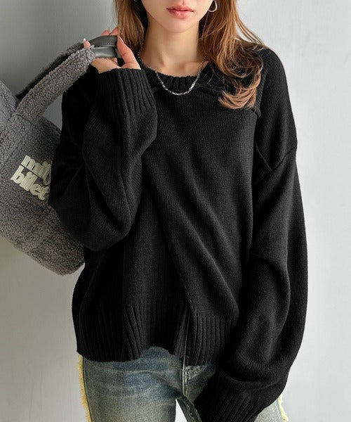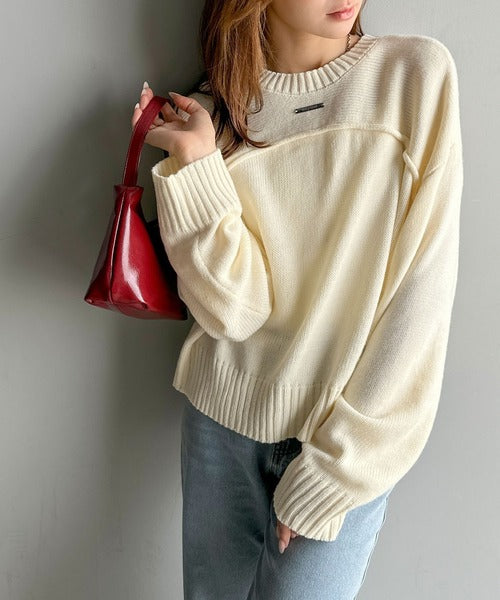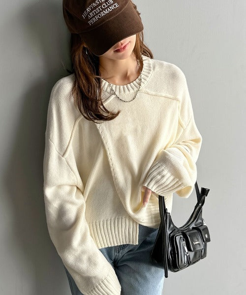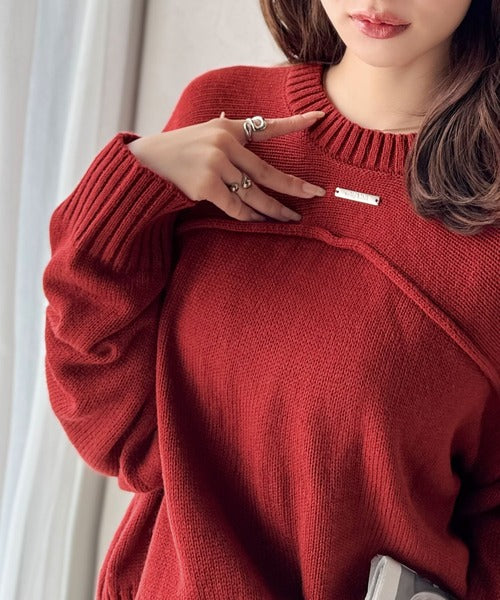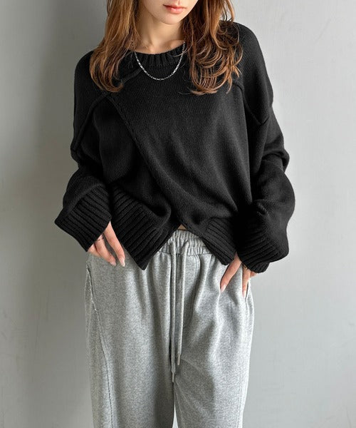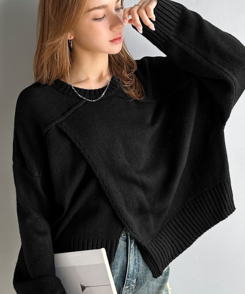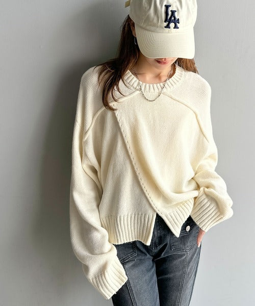 アシンメトリーなフロントデザインが目を引くデザインニットプルオーバー。