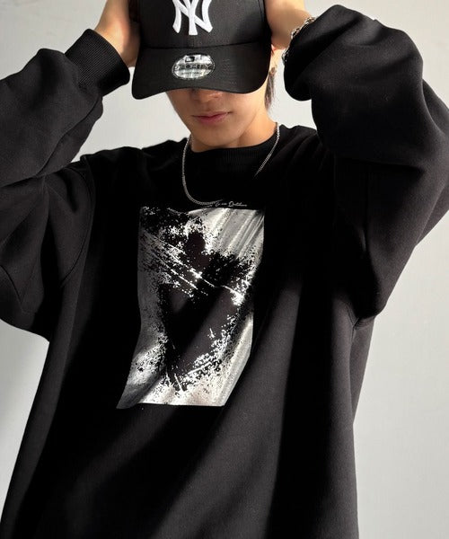 トレンドの光沢感を取り入れた箔プリントがポイントの「かすれボックス箔裏起毛スウェット」
