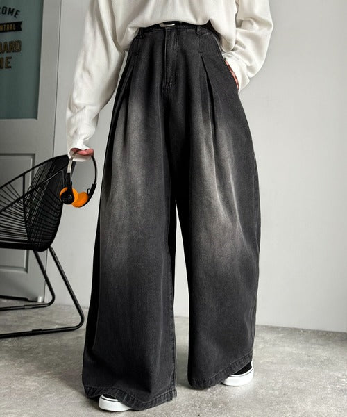 「変形3タックスーパーワイドデニム/Unique Three-Tuck Super Wide Denim」