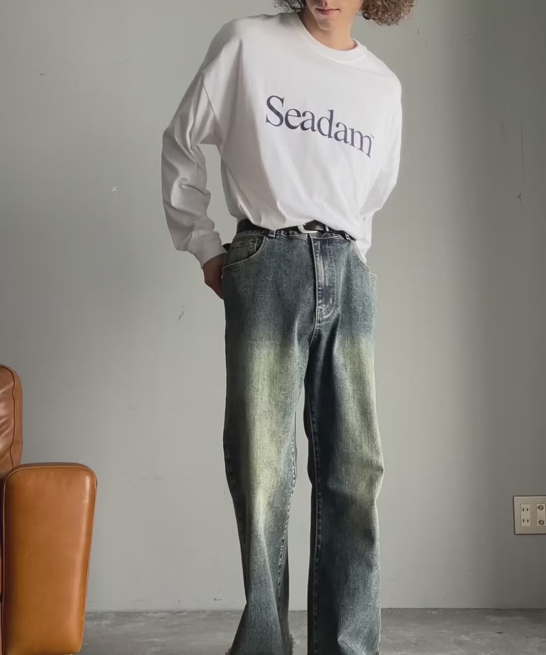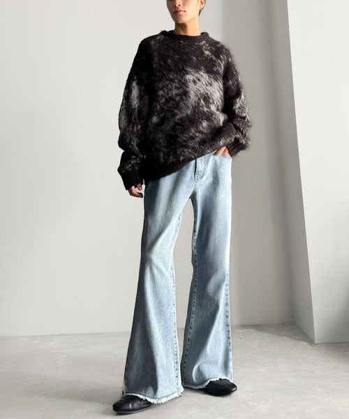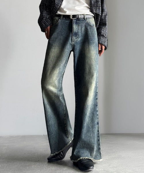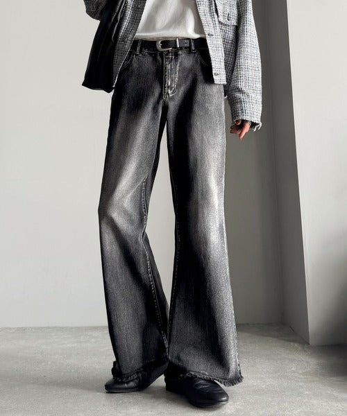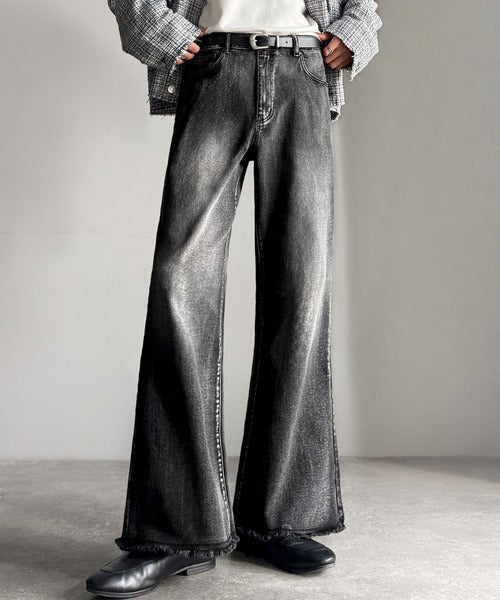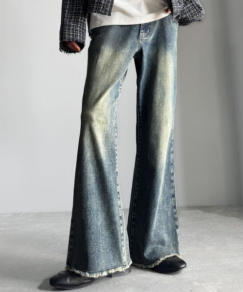 【Classical Origin】「スタイル盛れる。」ブラスト&裾フリンジ加工ストレッチ素材スリムフレアデニムパンツ/Blasted & Fringed Stretch Slim Flare Denim Pants co0900008