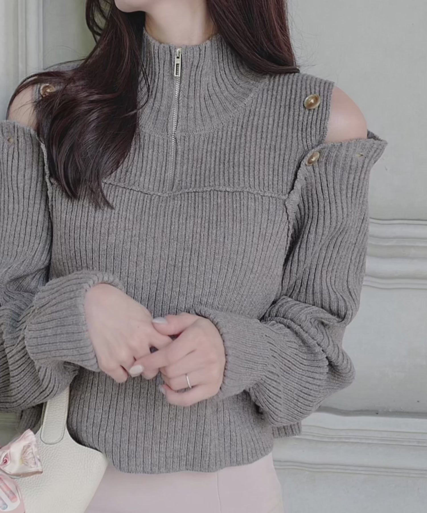 【mily bilet】上品なあざとかわいい。肩スリット2WAYボタン使いハーフジップリブニット mi1029071