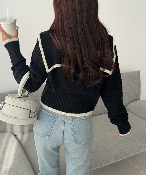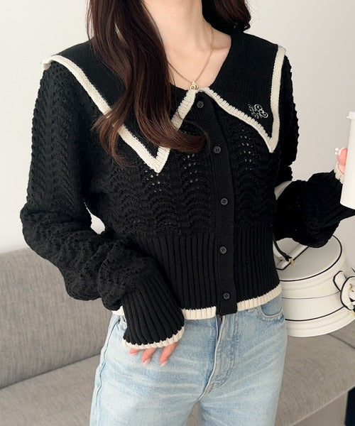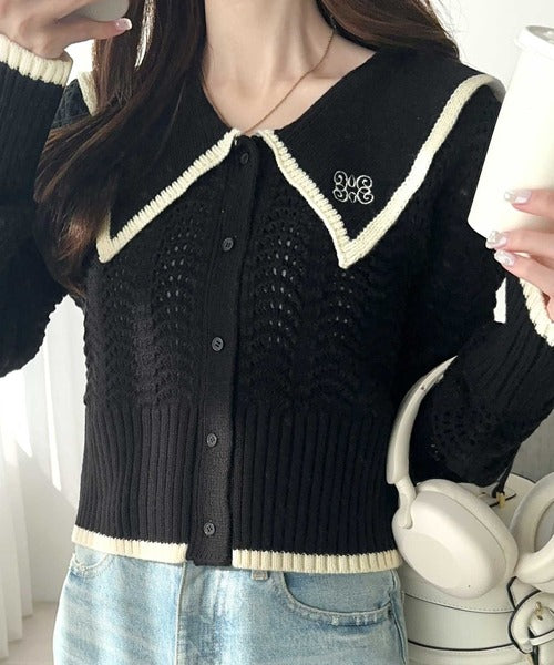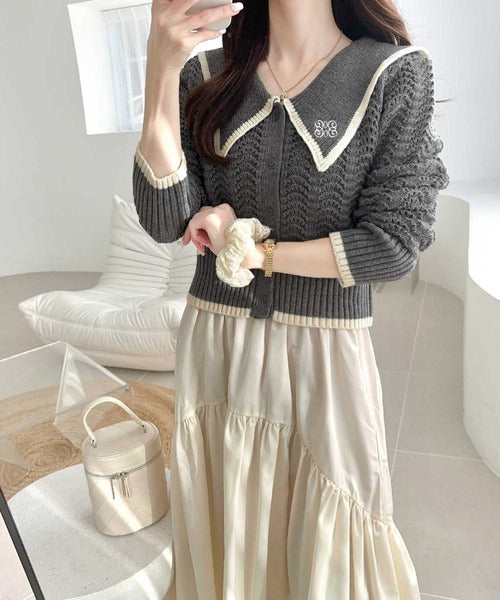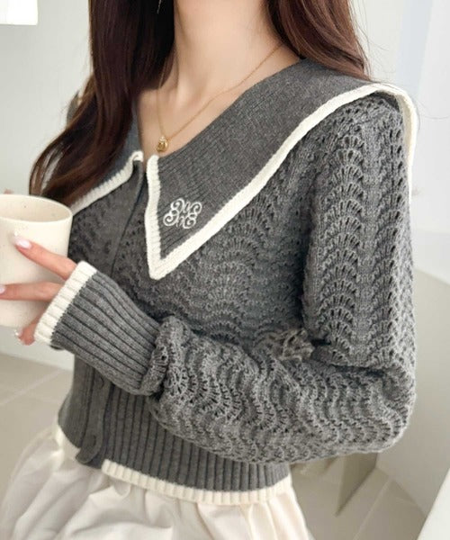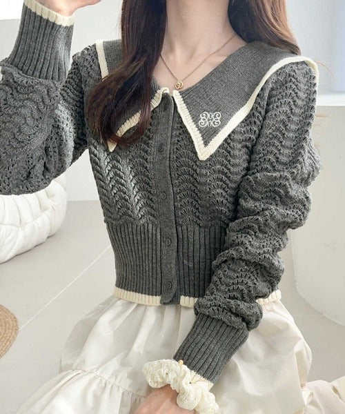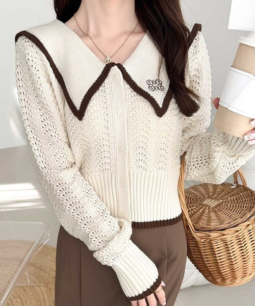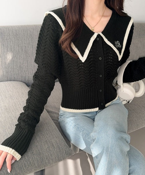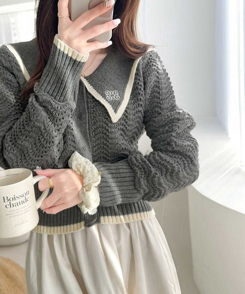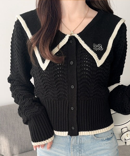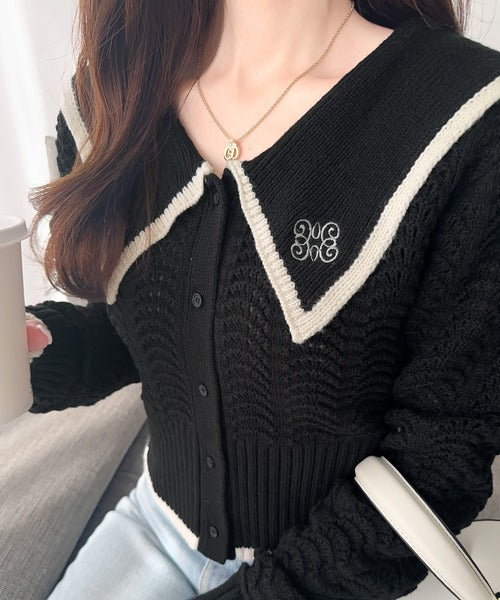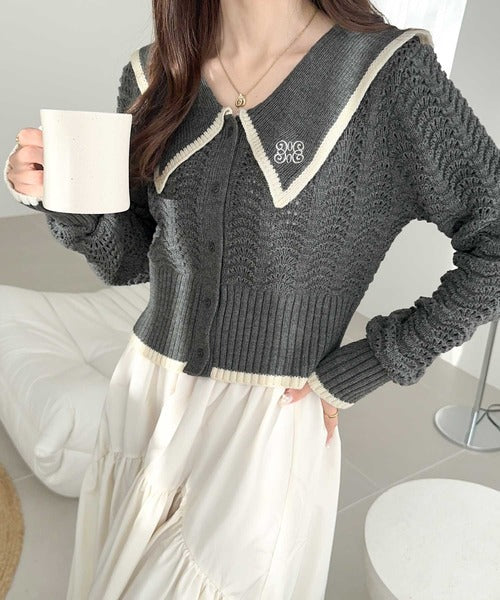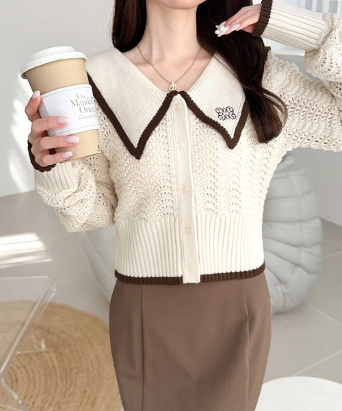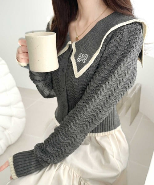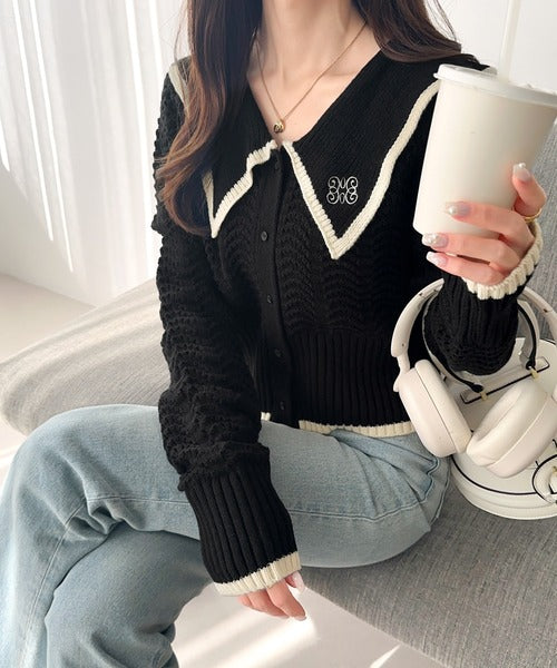 大きくて広い襟がポイントのビックカラーニットカーディガン。