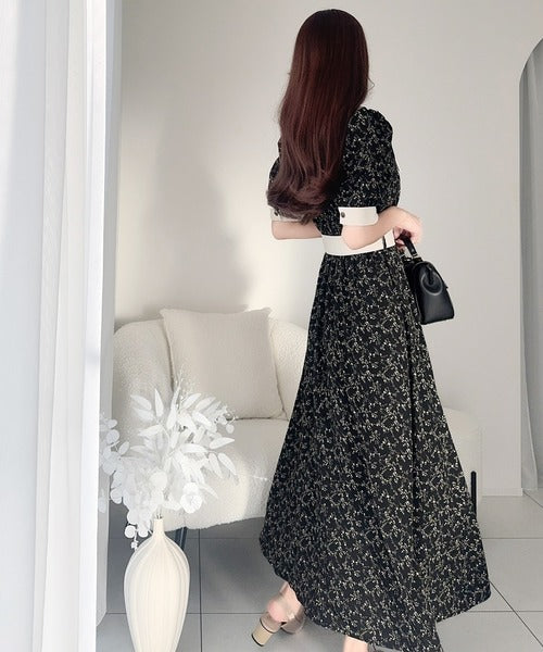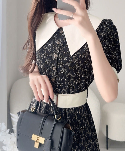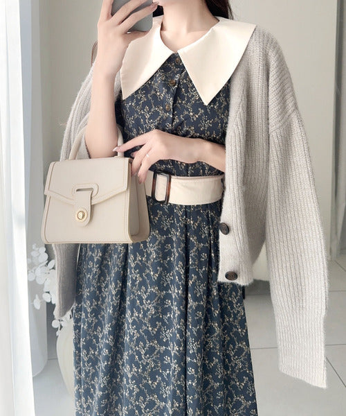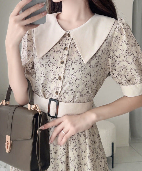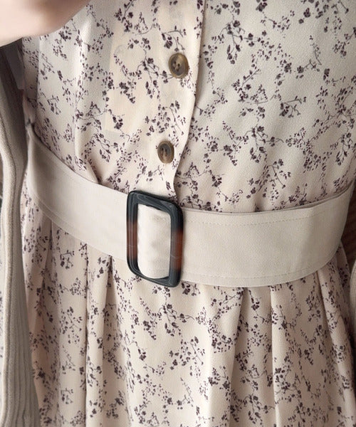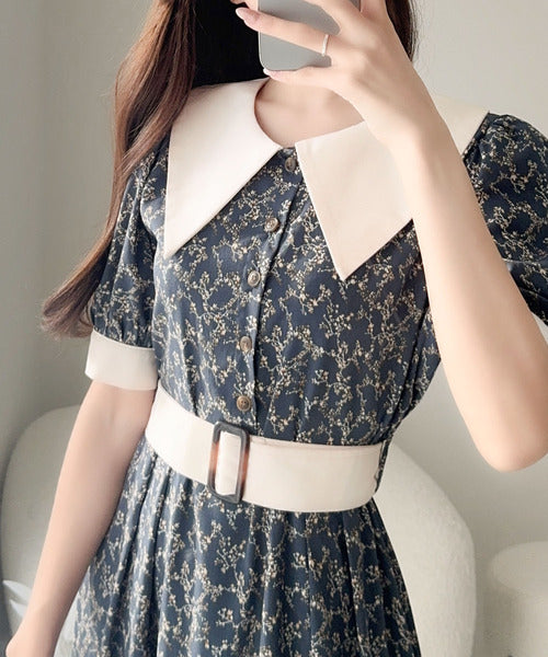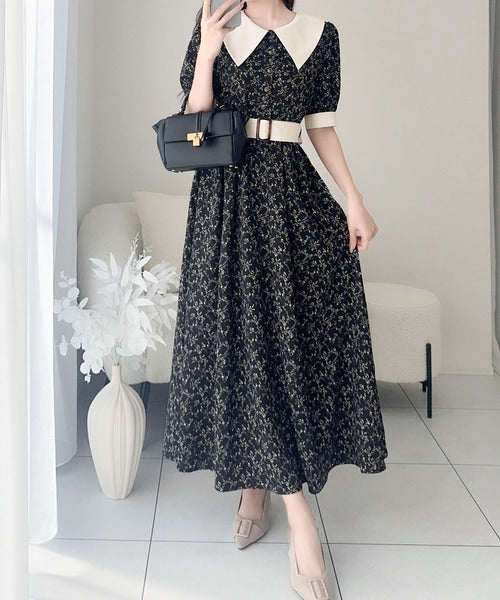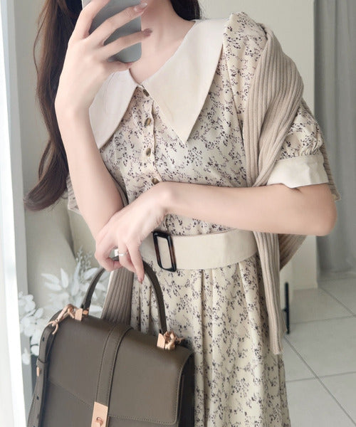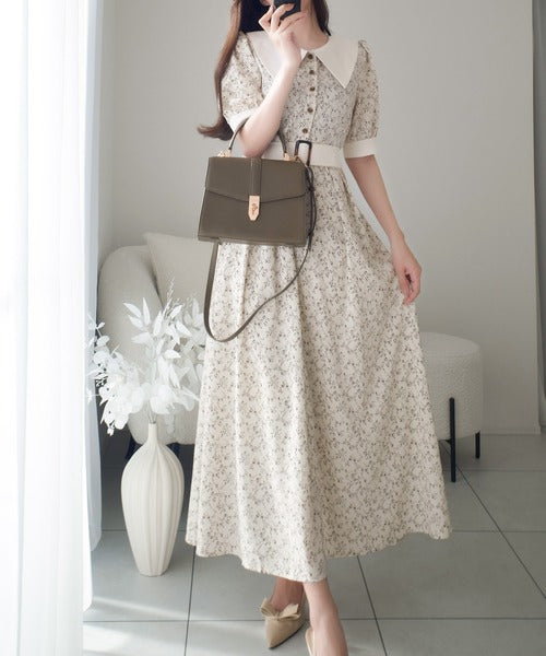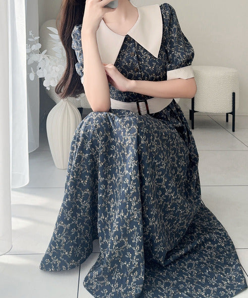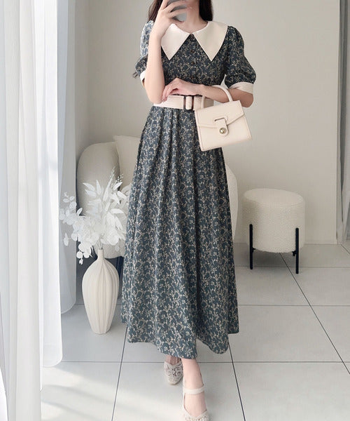 【mily bilet】トレンドのレトロガーリー♪小花柄ベルト付きビッグカラーワンピース(ロング丈) mi1139044