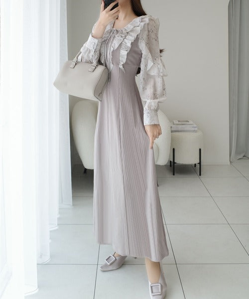 リブ素材をベースに、異素材の甘めフリルを施した主役級ワンピース。
