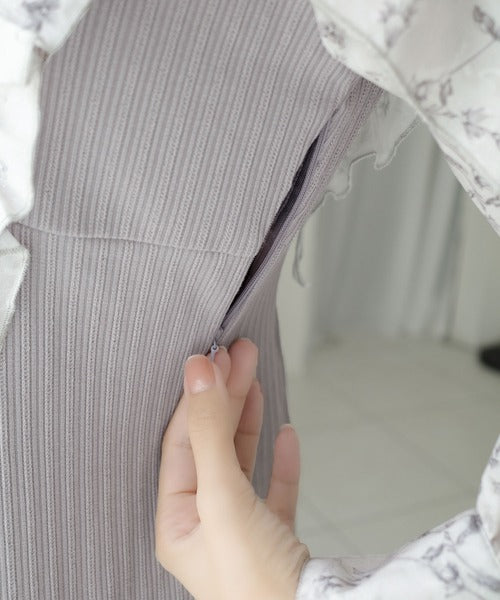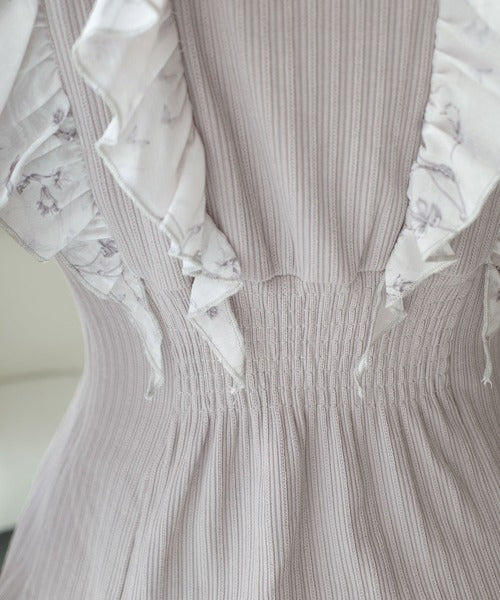 花柄フリルをドッキングしたリブワンピース。