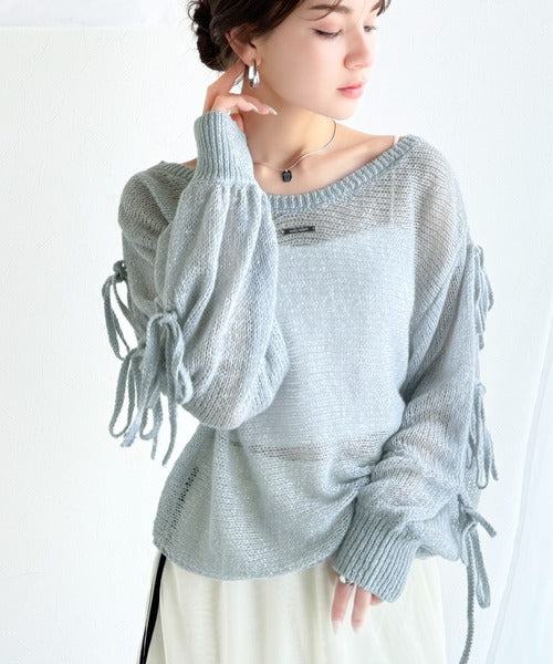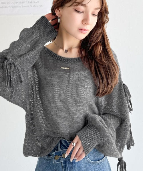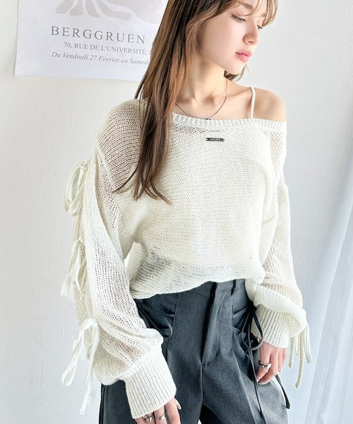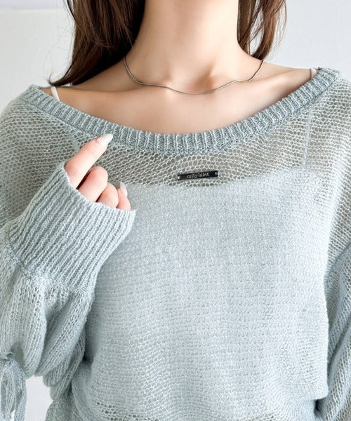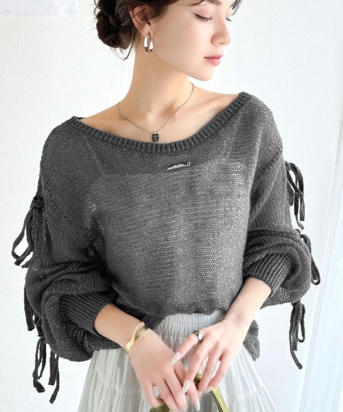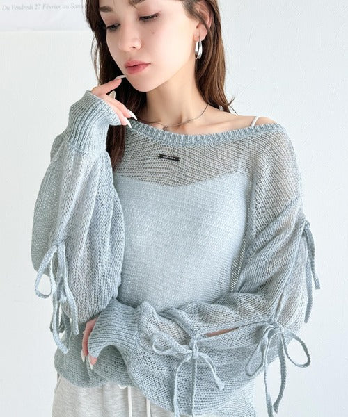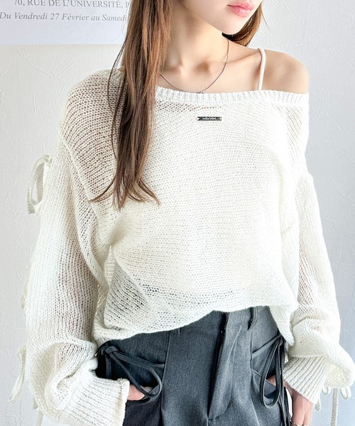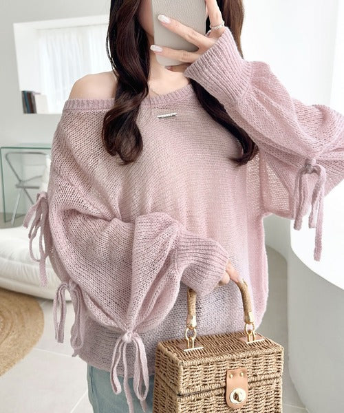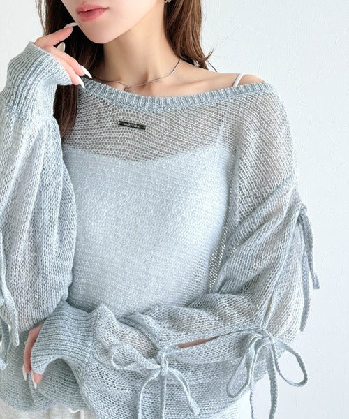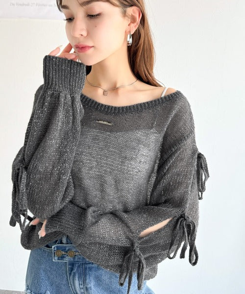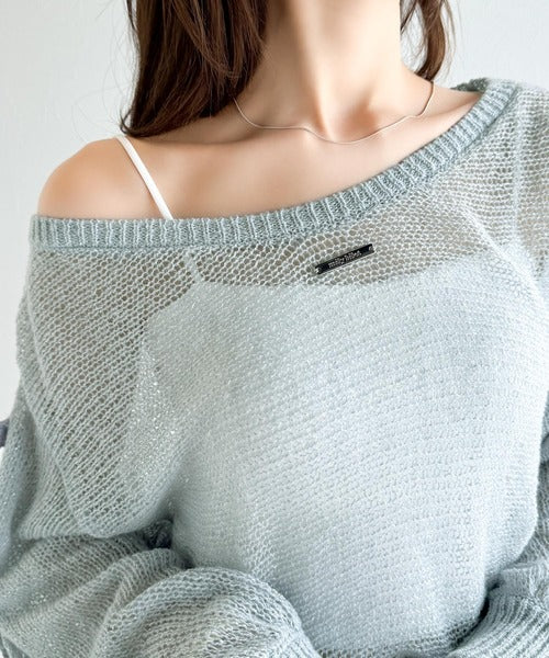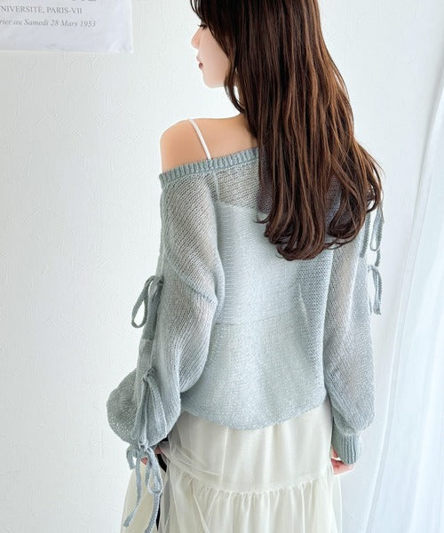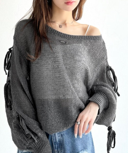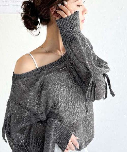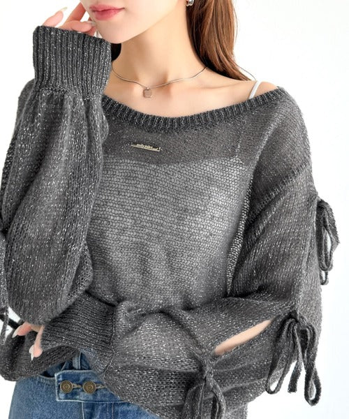 【mily bilet】大人のきらめき。プレートデザイン透かし編み袖リボンラメニット(ワンオフショル2way) mi1259009