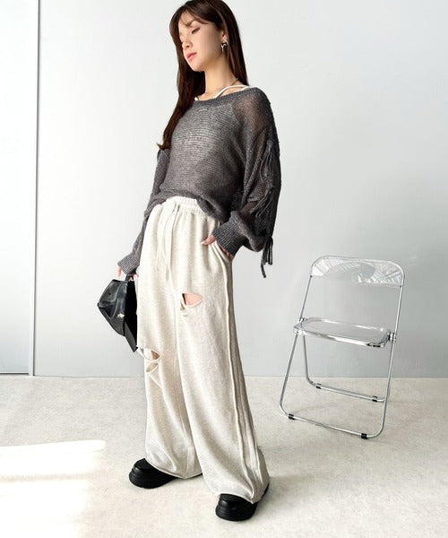 透かし編みのラメ入りニット。