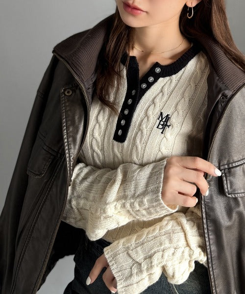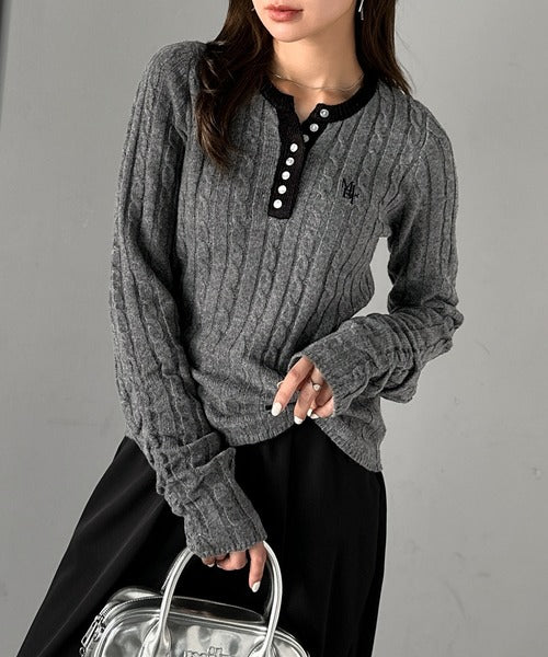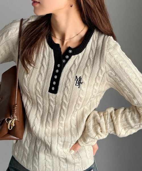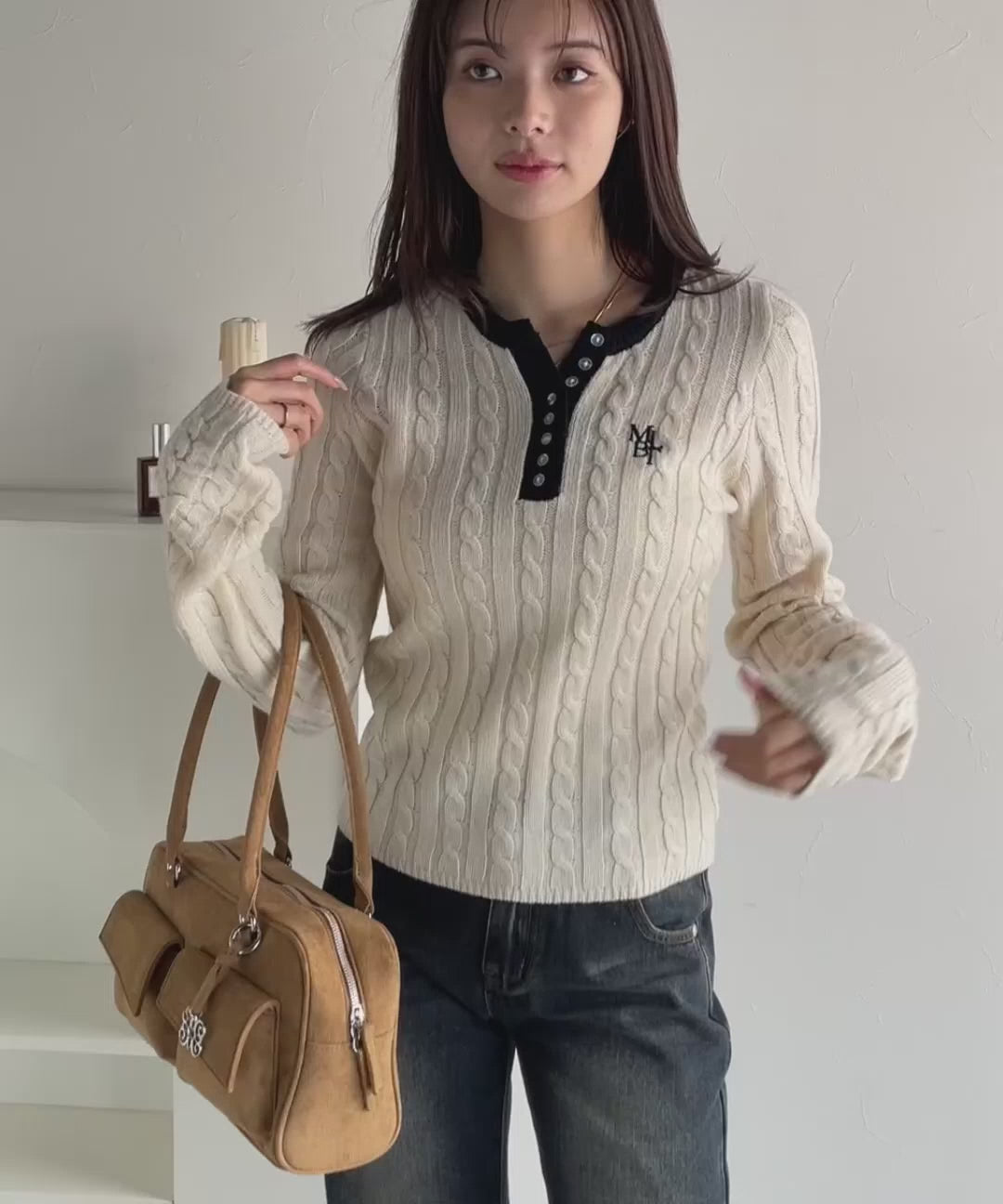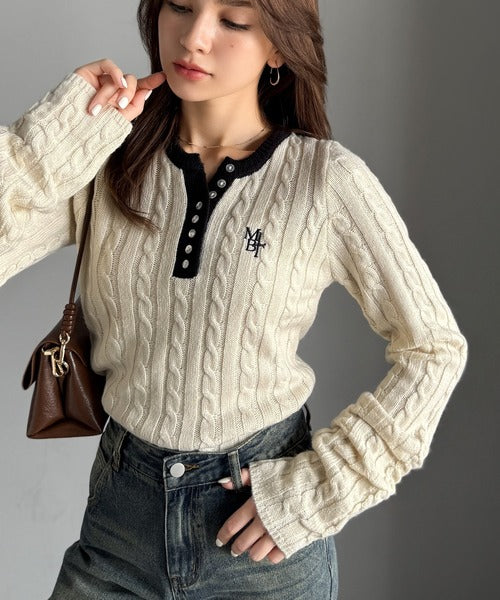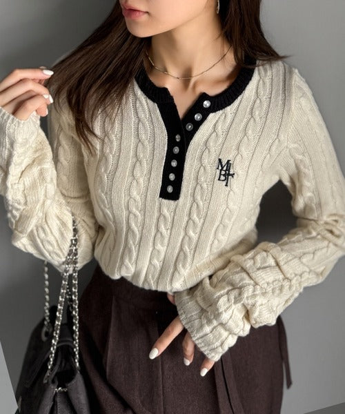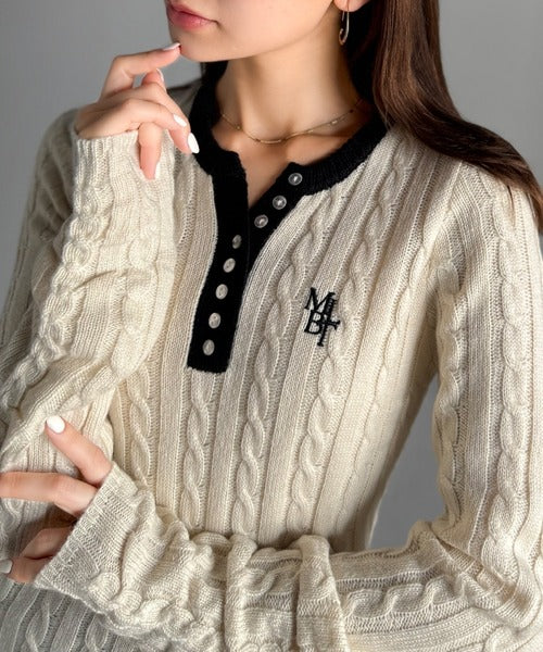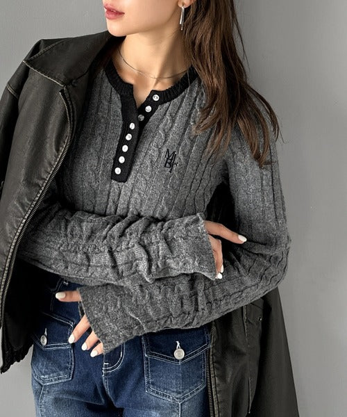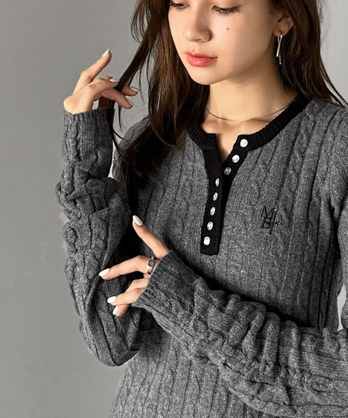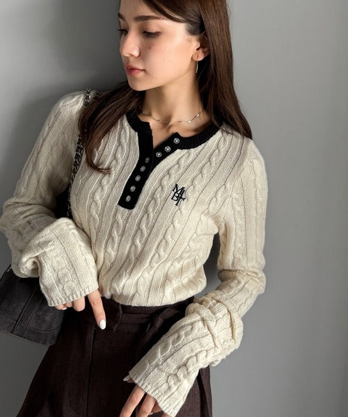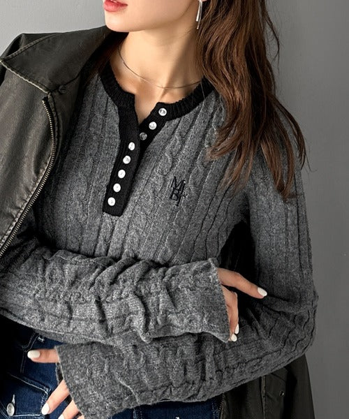 【mily bilet】シンプル映える欲張りニット。胸刺繍多ボタン使い袖シャーリングヘンリーケーブル編みニット(長袖) mi1329062