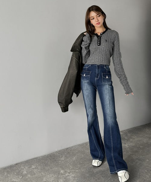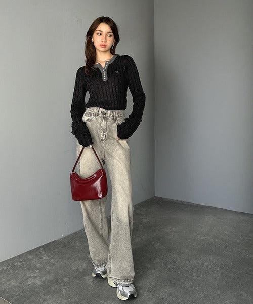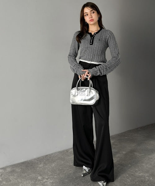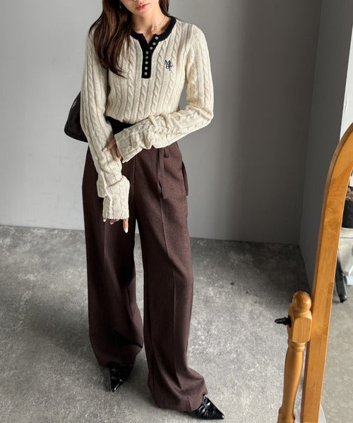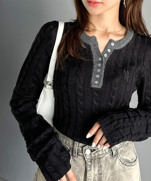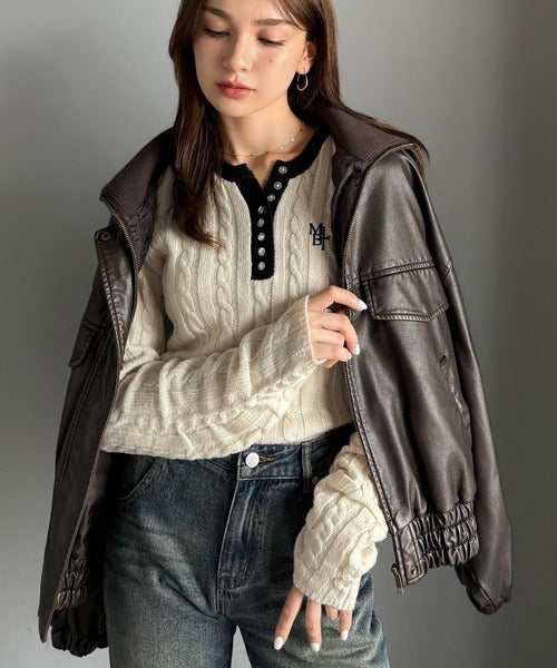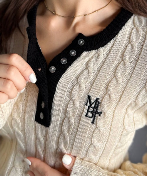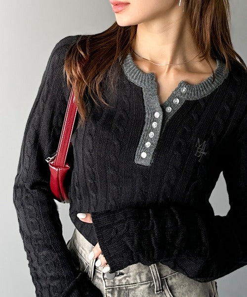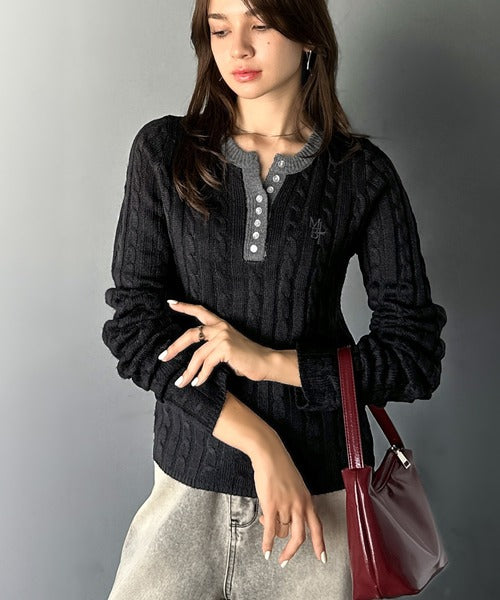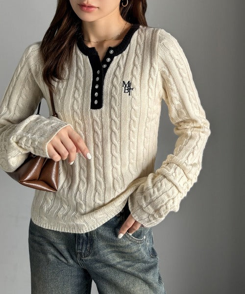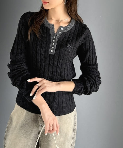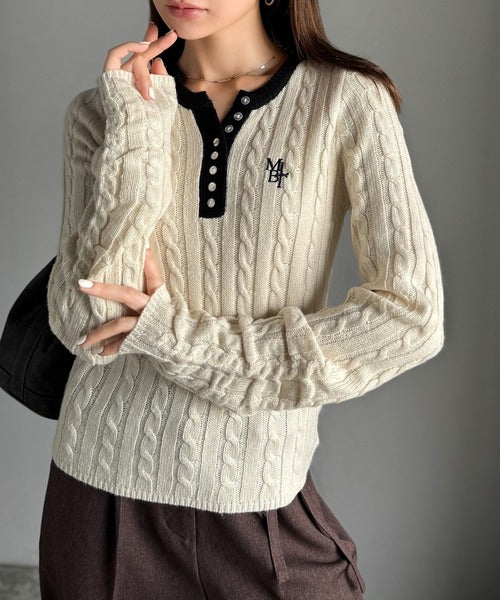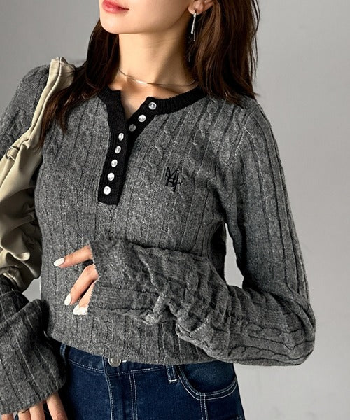 【mily bilet】シンプル映える欲張りニット。胸刺繍多ボタン使い袖シャーリングヘンリーケーブル編みニット(長袖) mi1329062