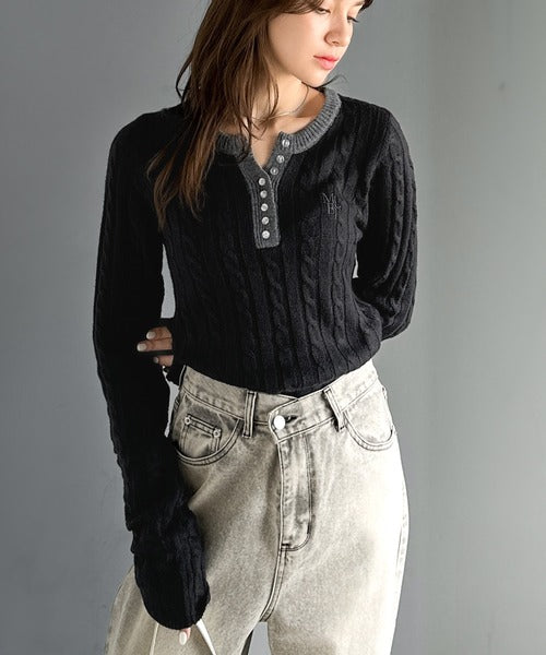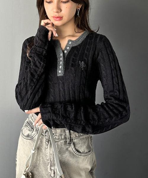 細かなケーブル編みをベースに、配色デザインのヘンリーネックが可愛いニット♪