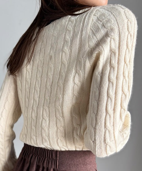 落ち着きカラーの配色ネックが魅力の大人なケーブル編みニット♡