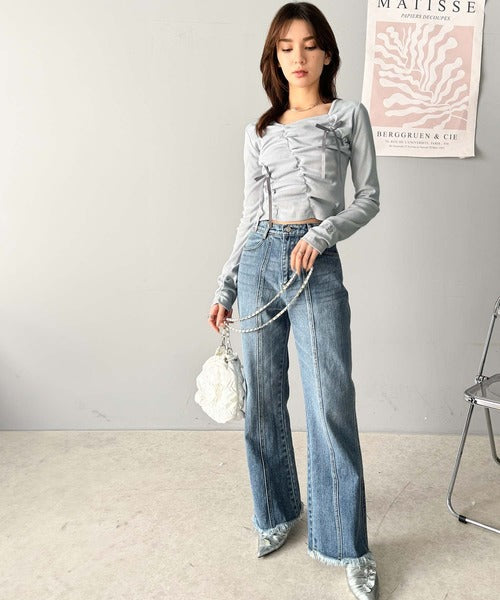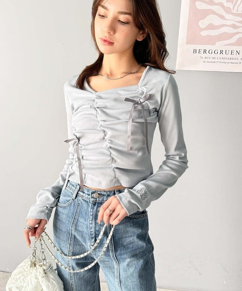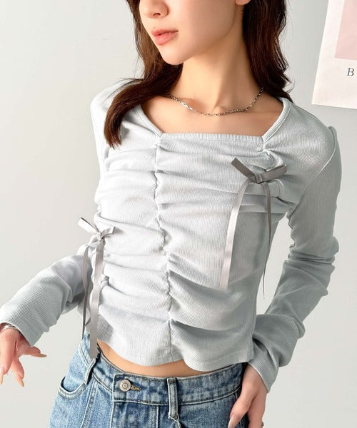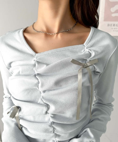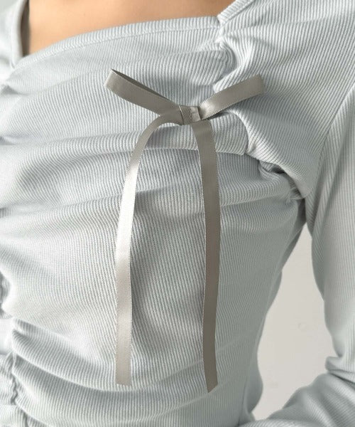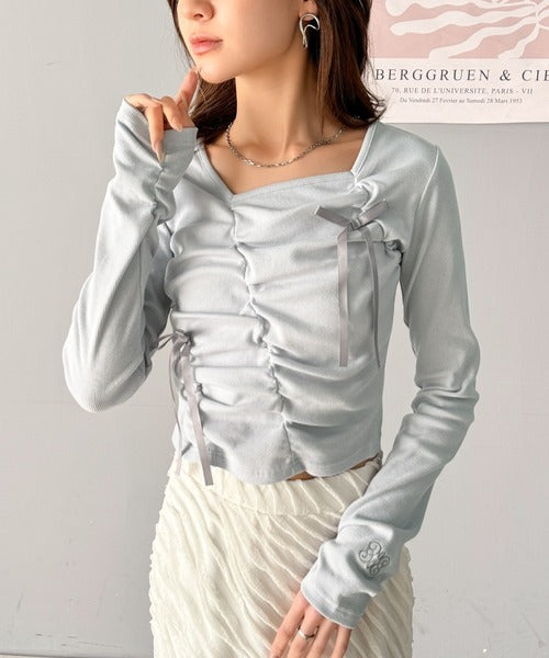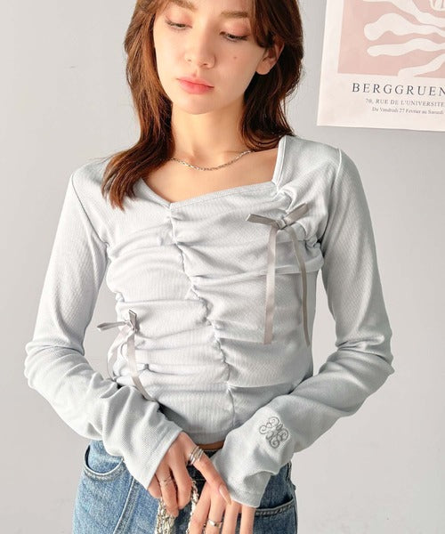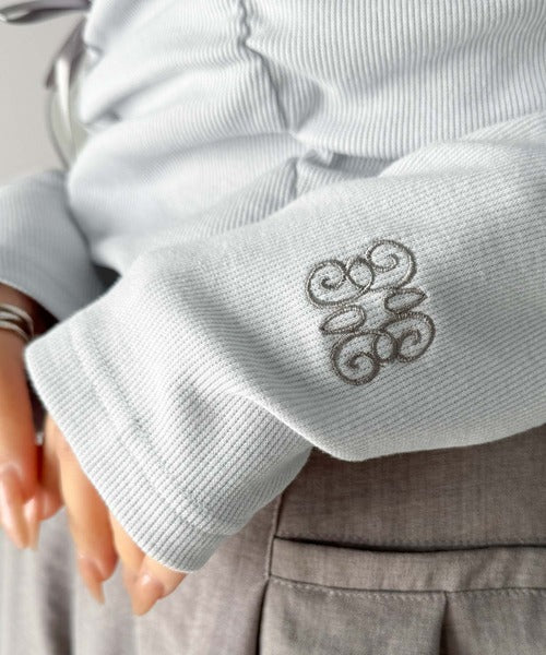 【mily bilet】大人ガーリーな雰囲気。サテンリボン付き袖口刺繍ギャザーリブカットソー mi1359003