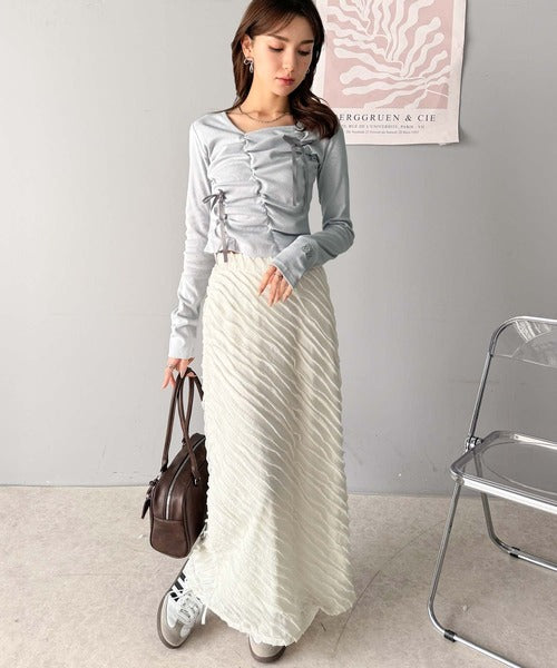 トレンドのシャーリングリボンデザインが甘すぎず、万能アイテムに。