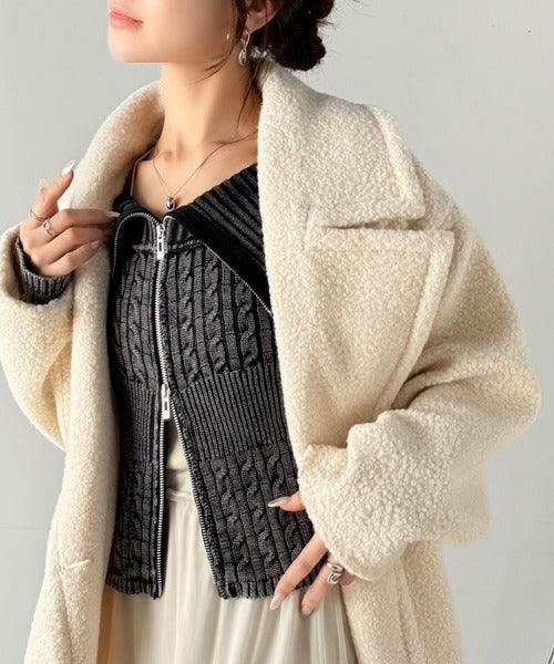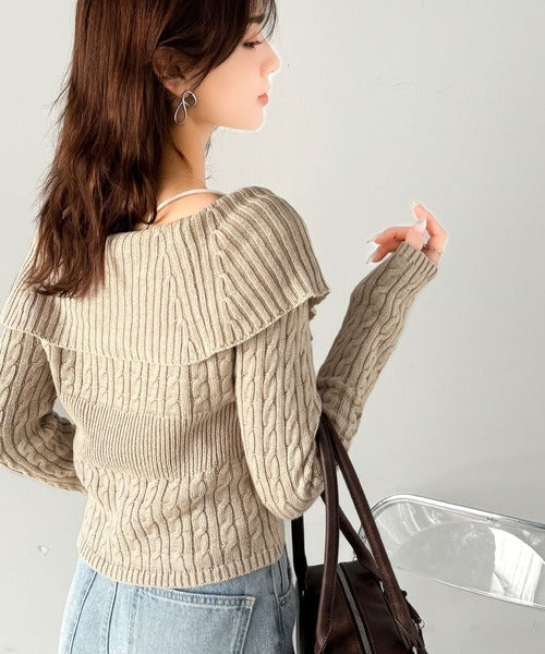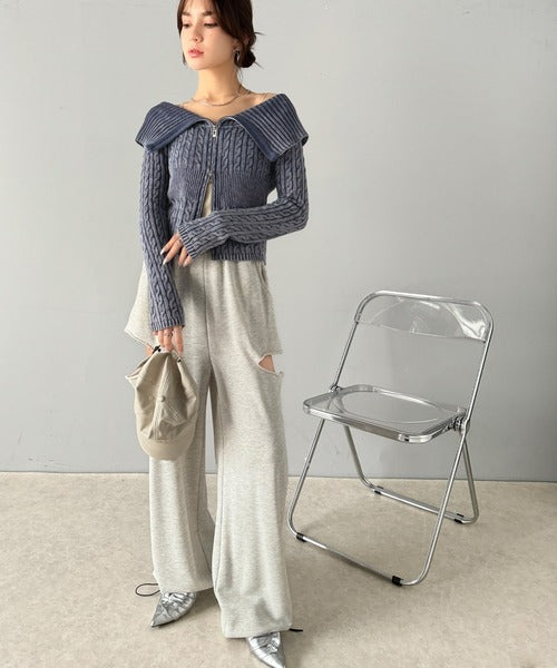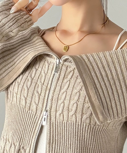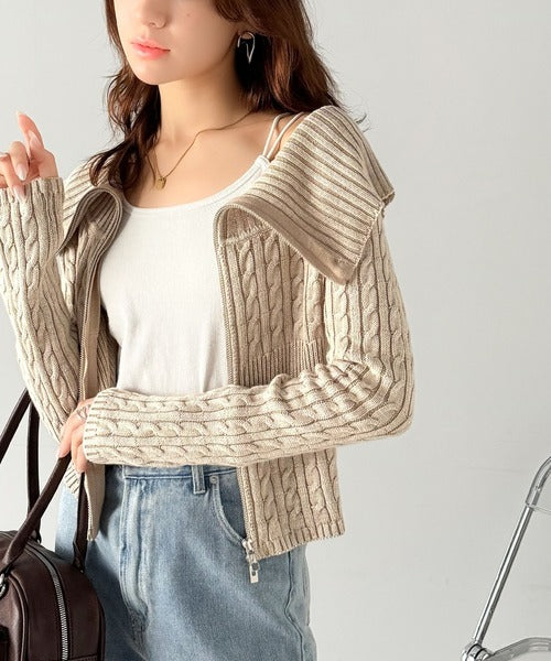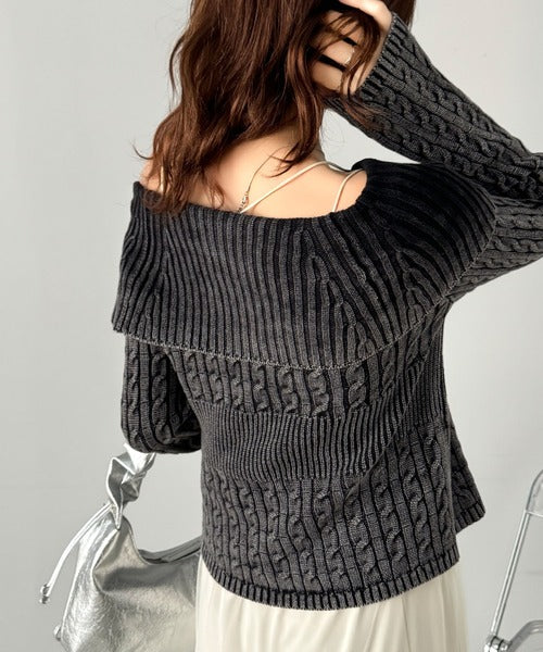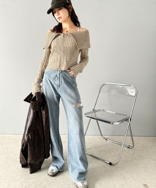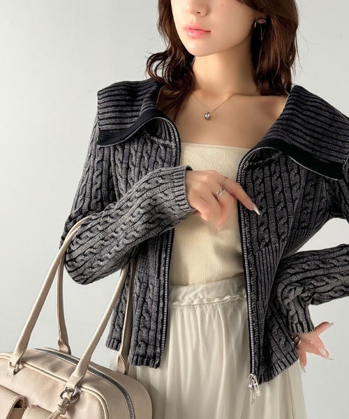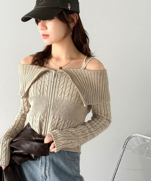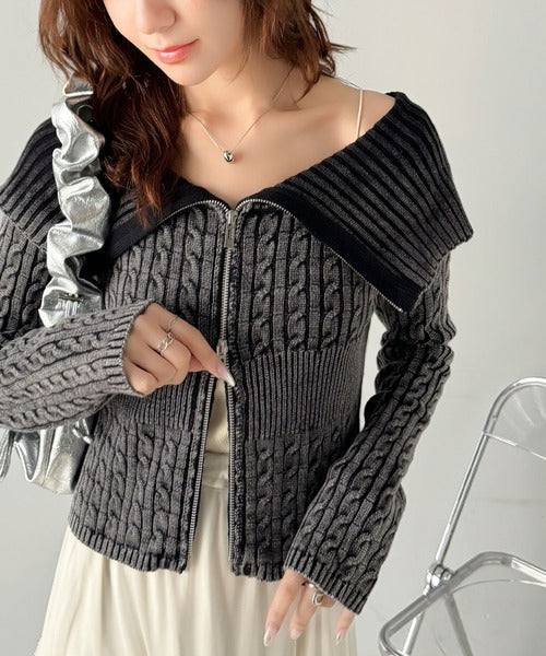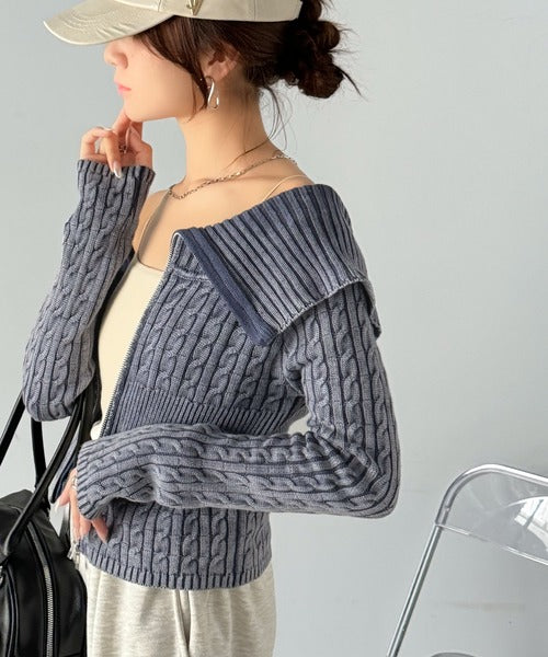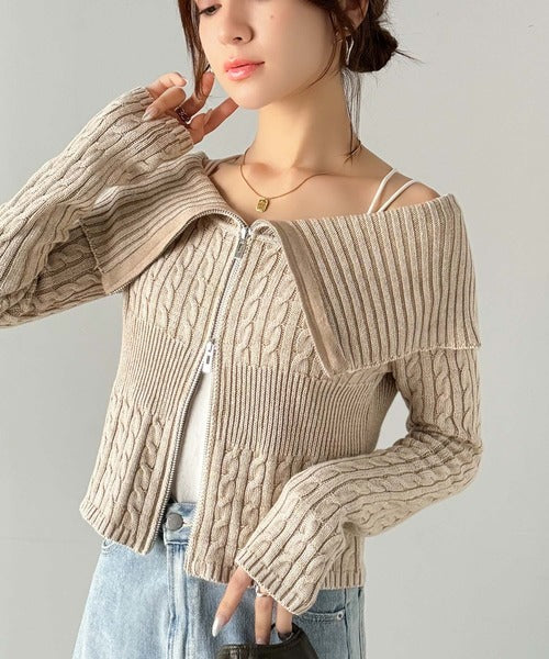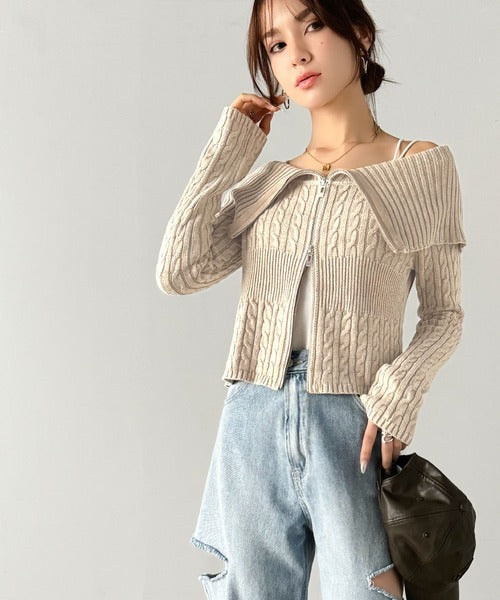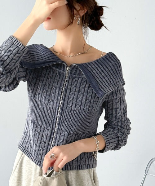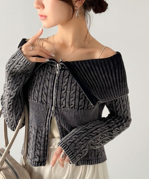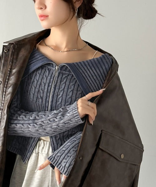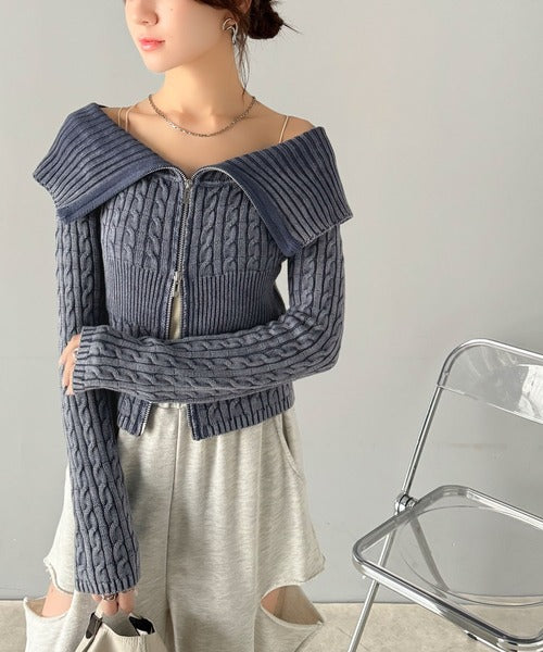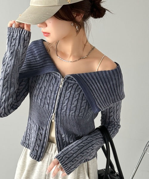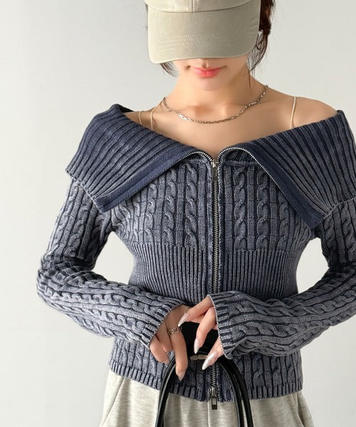【mily bilet】大活躍間違いなし♪綿100%ダブルジップストーンウォッシュオフショル2WAYケーブルニット(ショート丈) mi1359007