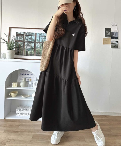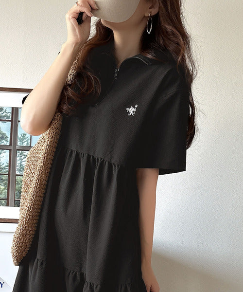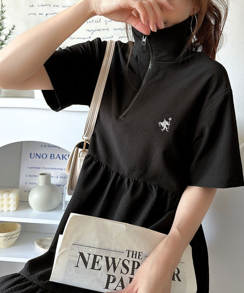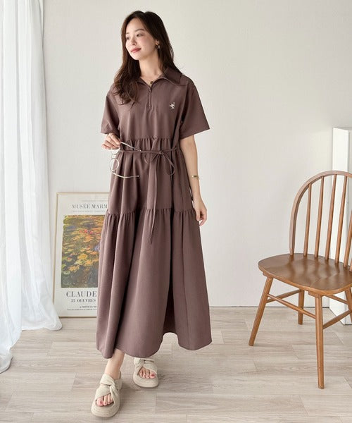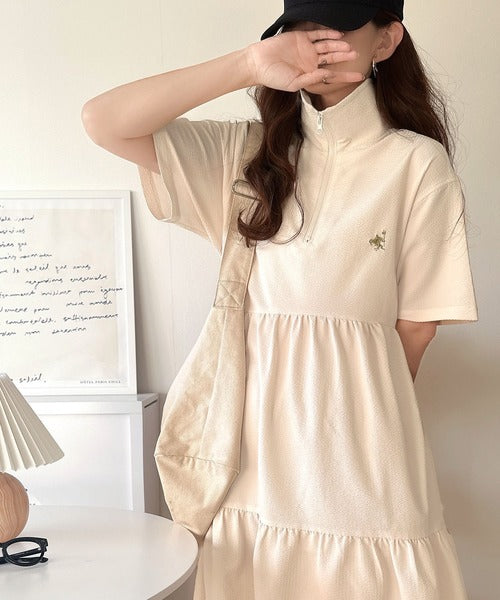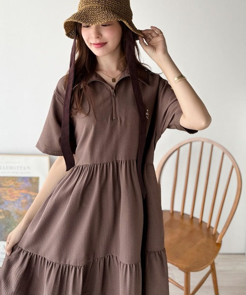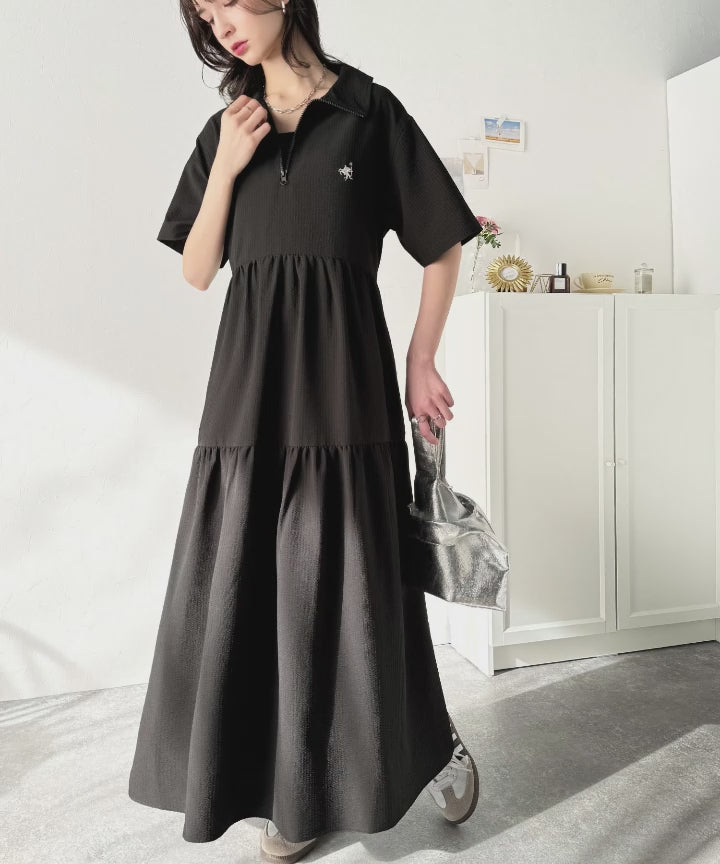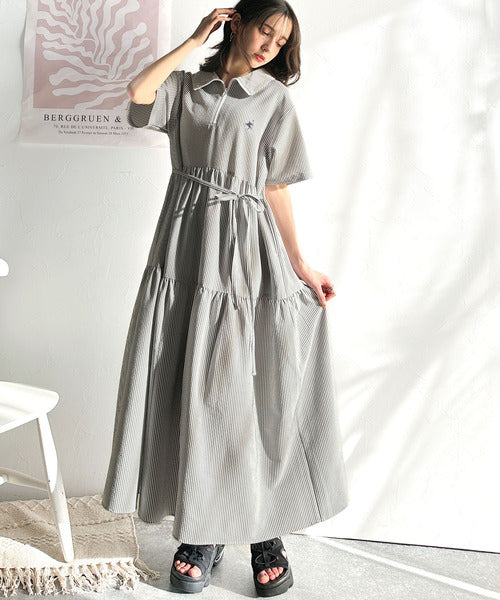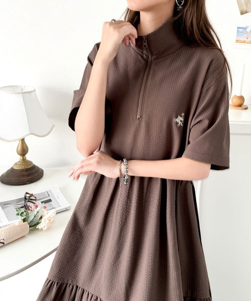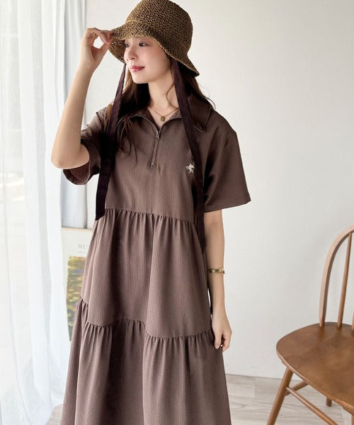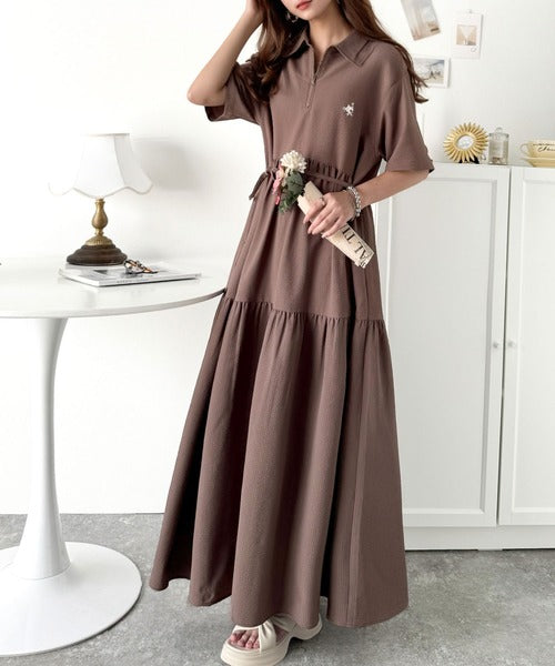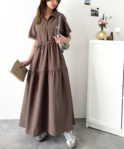 トレンドのティアード♪胸刺繍サッカーハーフZIPワンピース(ロング) ce1260303