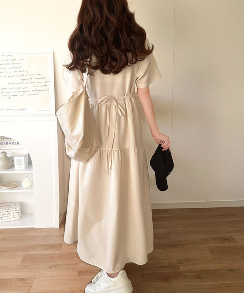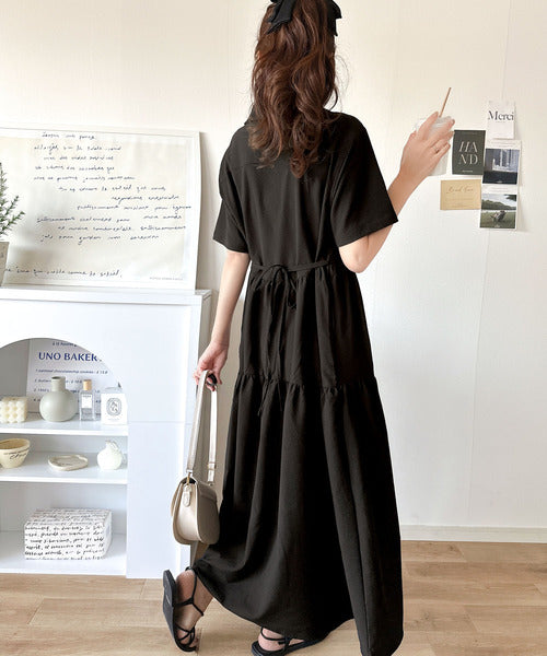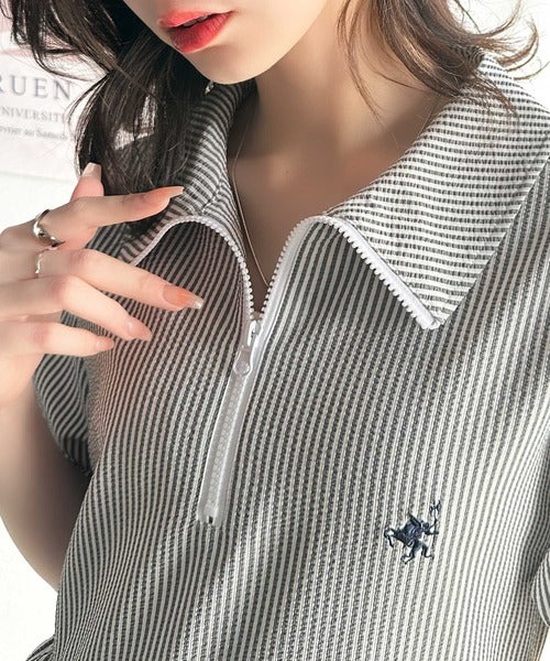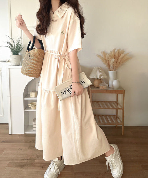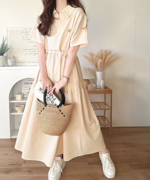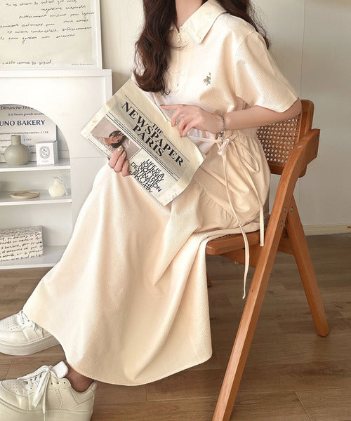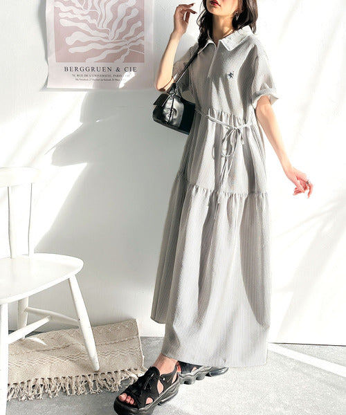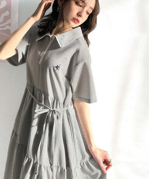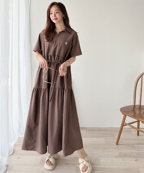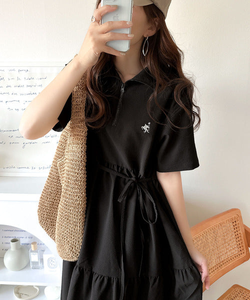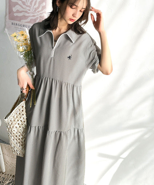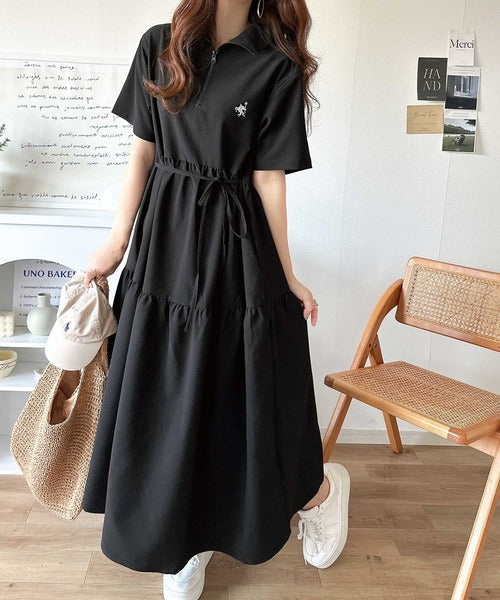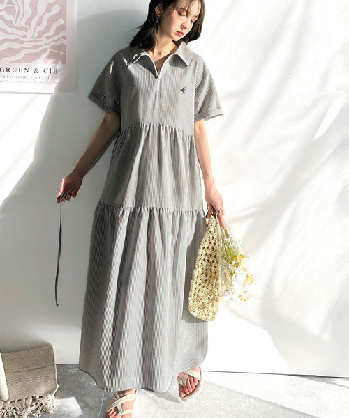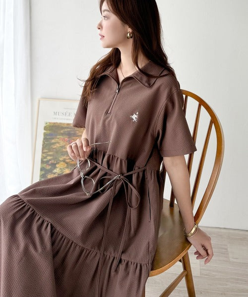 トレンドのティアード♪胸刺繍サッカーハーフZIPワンピース(ロング) ce1260303