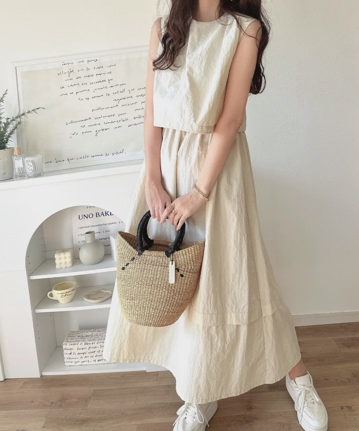 1枚で即お洒落見え。セットアップ風Aラインノースリーブロングワンピース ce1260341