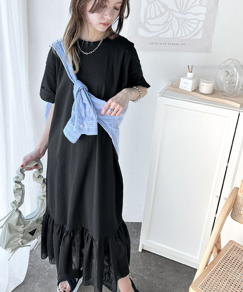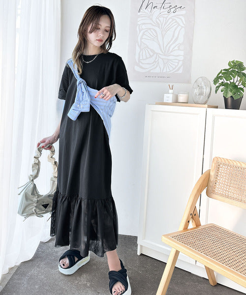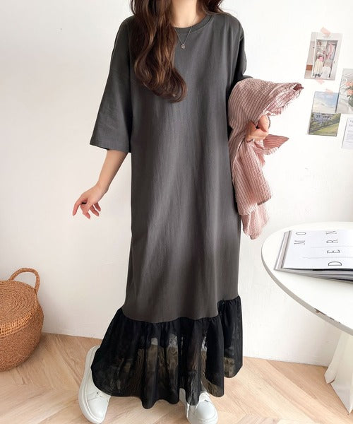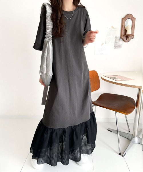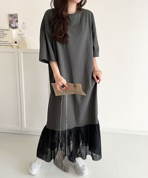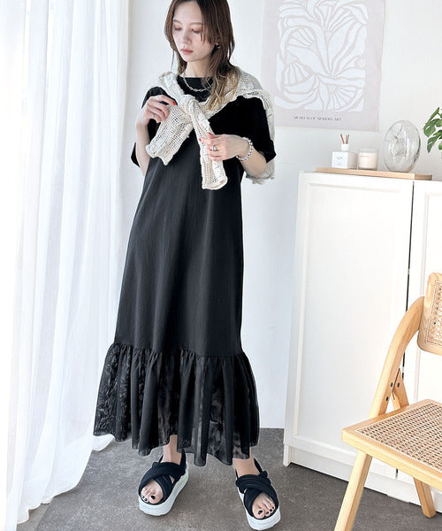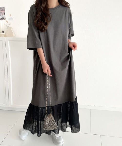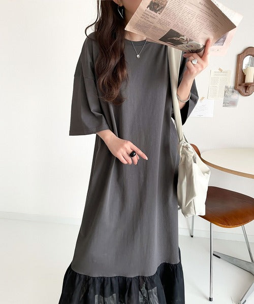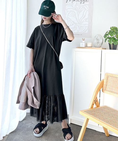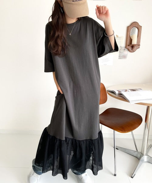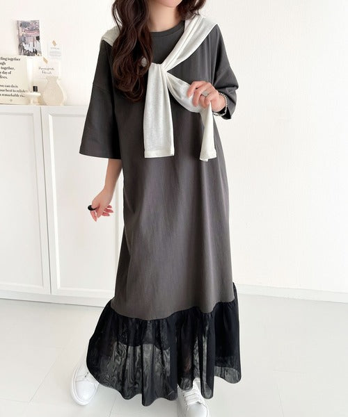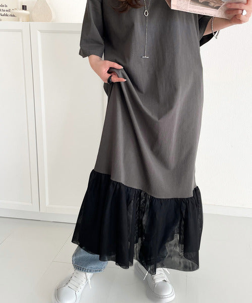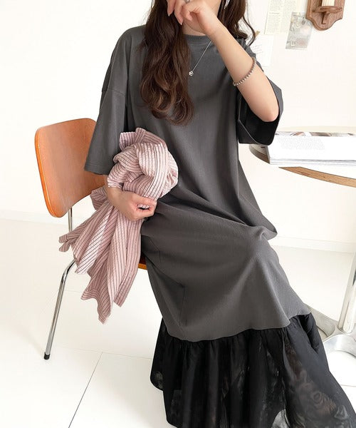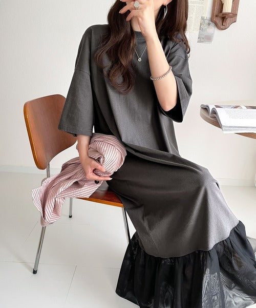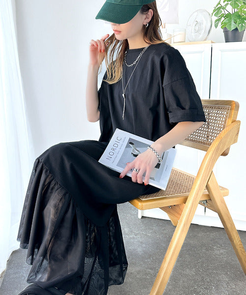 1枚で高級感とお洒落を両立!レイヤード風チュールコンビTシャツワンピース♪