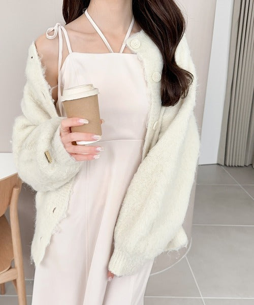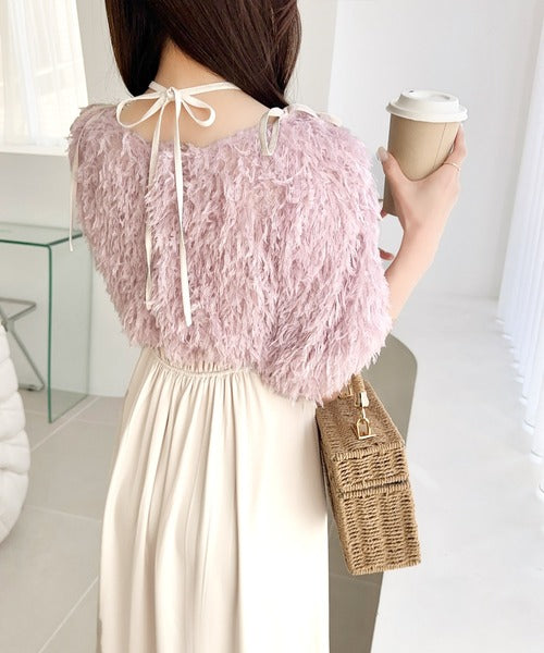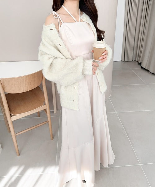 トレンドのシャギーカーデとリボンキャミが織りなす、魅力的なアンサンブル!