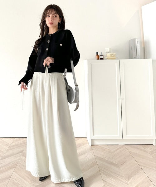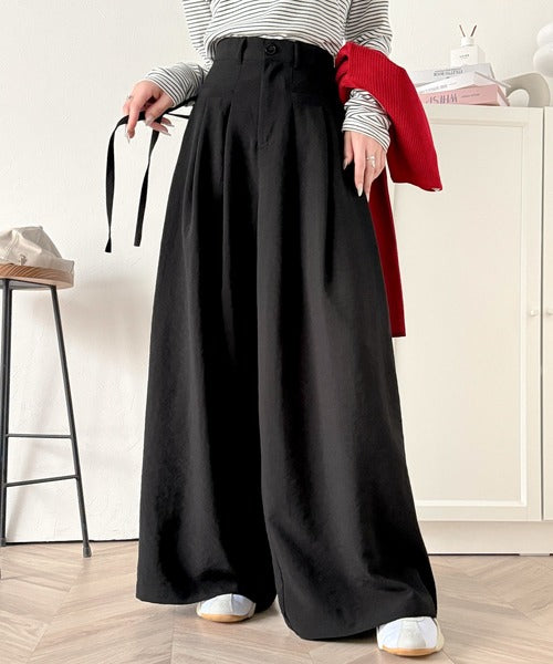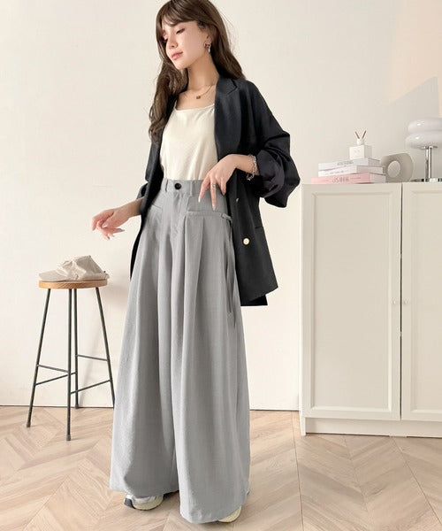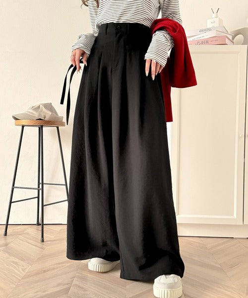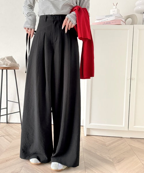 3タック入りのハイウエスト&ワイドシルエットで脚長効果抜群。