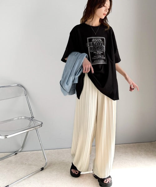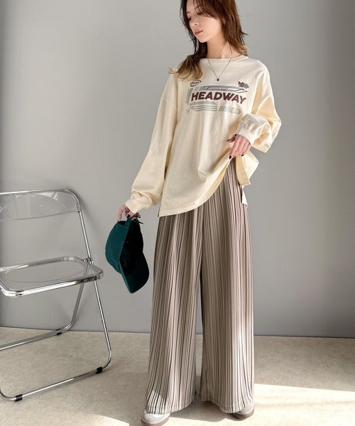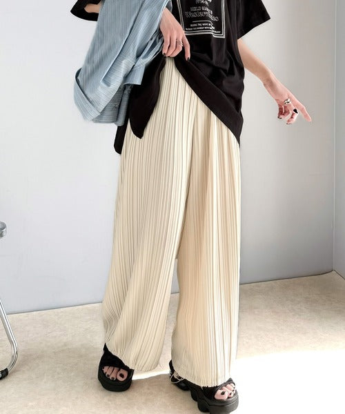 カジュアルながらも洗練された印象を与えるプリーツパンツ。