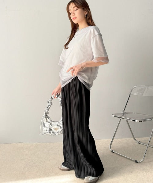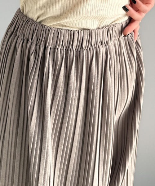 ワイドシルエットとプリーツの凹凸が体のラインを拾わず、